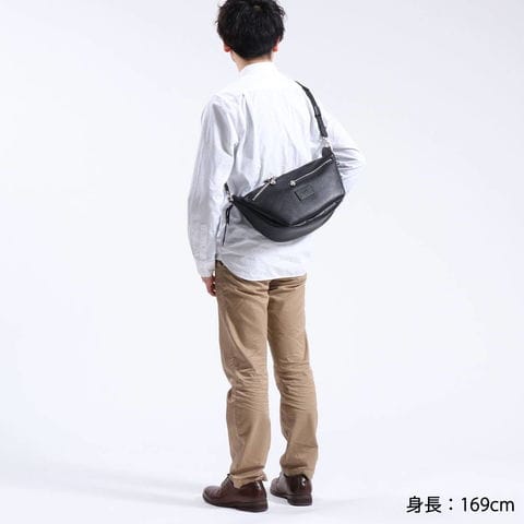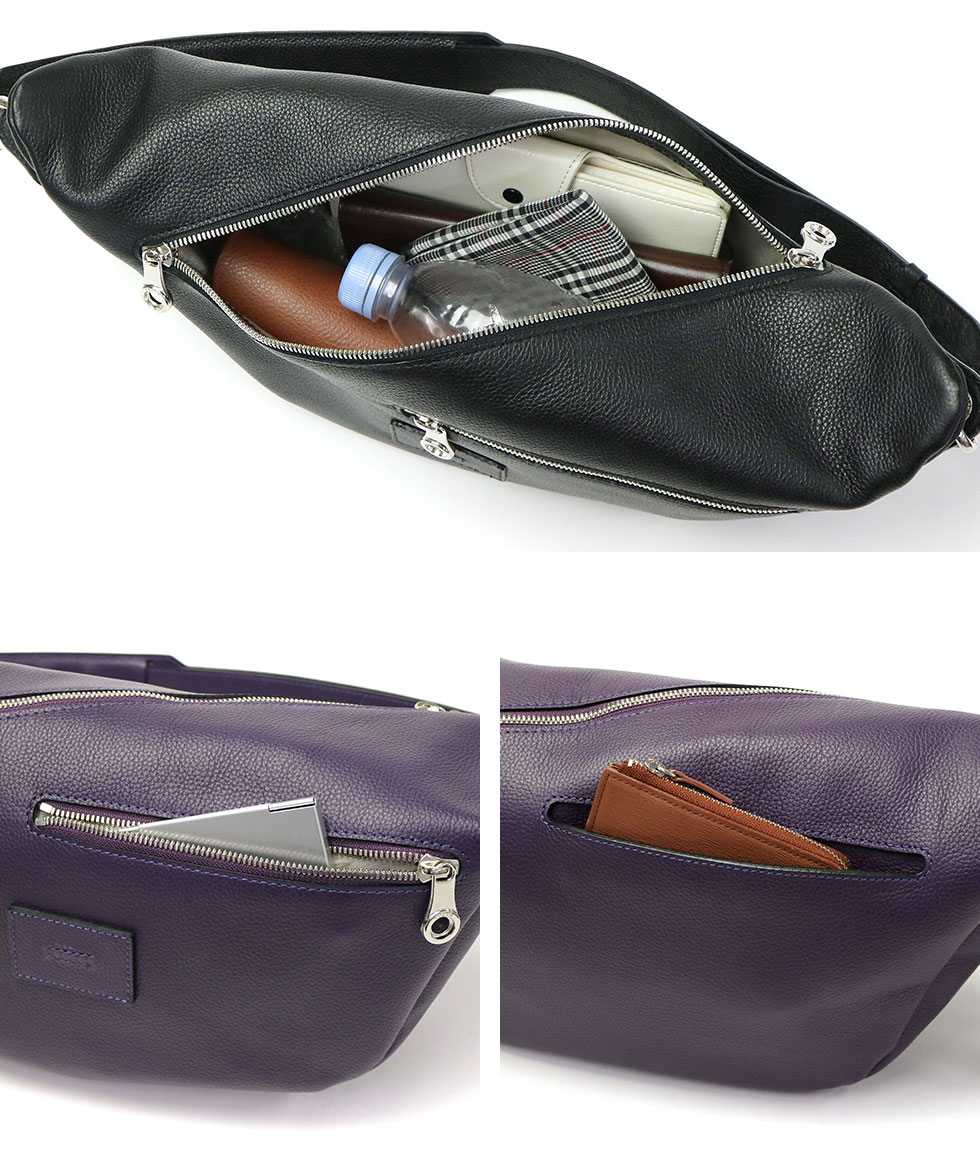 本体はオールレザーながらもナイロン製に劣らないほどの軽さで、性別を問わずお使いいただけます。長財布に手帳、ペットボトルが収納可能で、内外にはスマートフォンなどの小物管理に便利なポケットを備えています。両手を開けて外出したい休日のお出かけや旅行のサブバッグにもオススメです。
