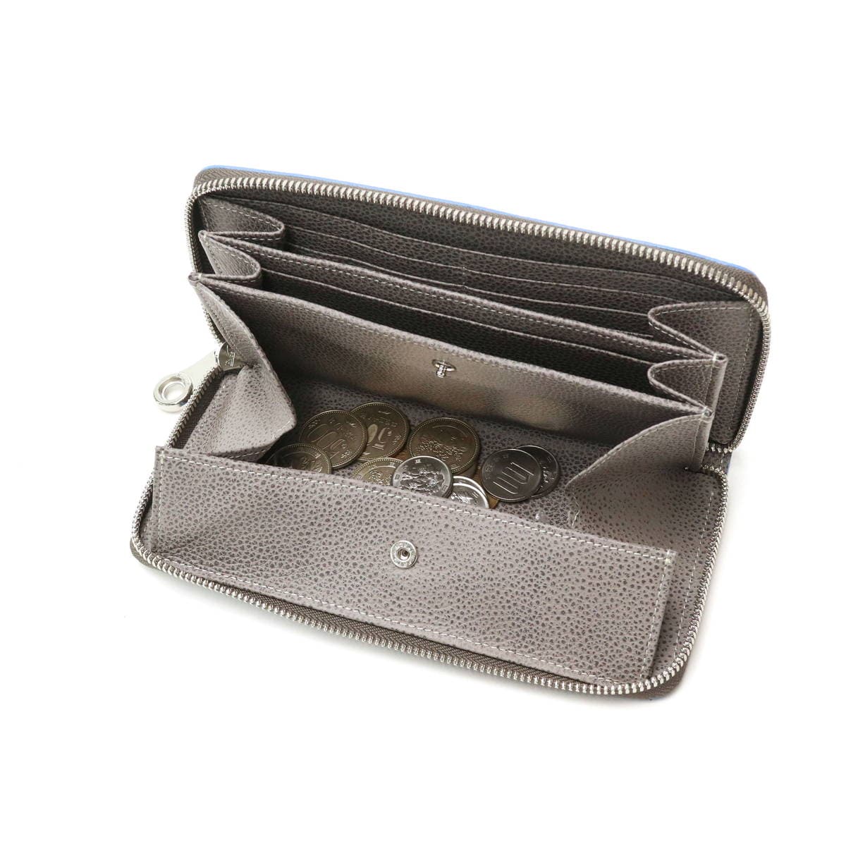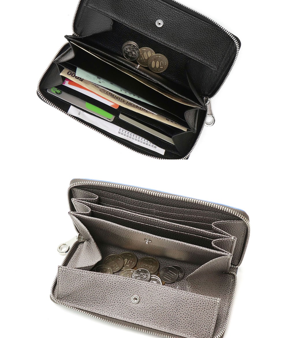 一目ですべてが見渡せる、少ないアクションでお金やカード類が取り出せるアクセスの良さが魅力の内装。小銭入れはギャルソンウォレットのようにガバッと開き、取り出しやすいよう工夫されています。長財布の特性を生かし収納力抜群で、4インチ程度の小型スマホであれば収納が可能です。