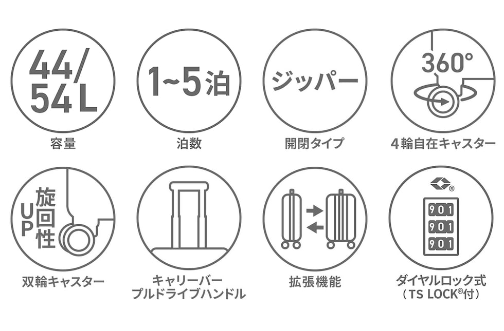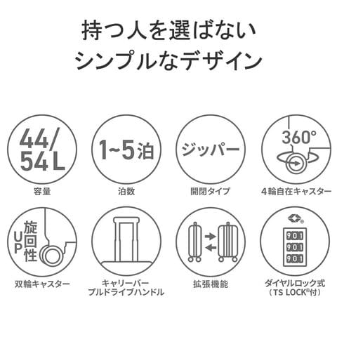 スタイリッシュな縦リブが印象的な『モンターニャ』シリーズのスーツケース。性別問わずお使いいただけるシンプルでマットなデザインです。サイドのファスナーを開くことで、44L?54Lまで容量が拡張するエキスパンダブル機能付き。1?5泊程の旅行に対応したサイズ感です。海外旅行にも安心のTSロック付きで、旅行を快適にサポートしてくれる仕上がりとなっています。