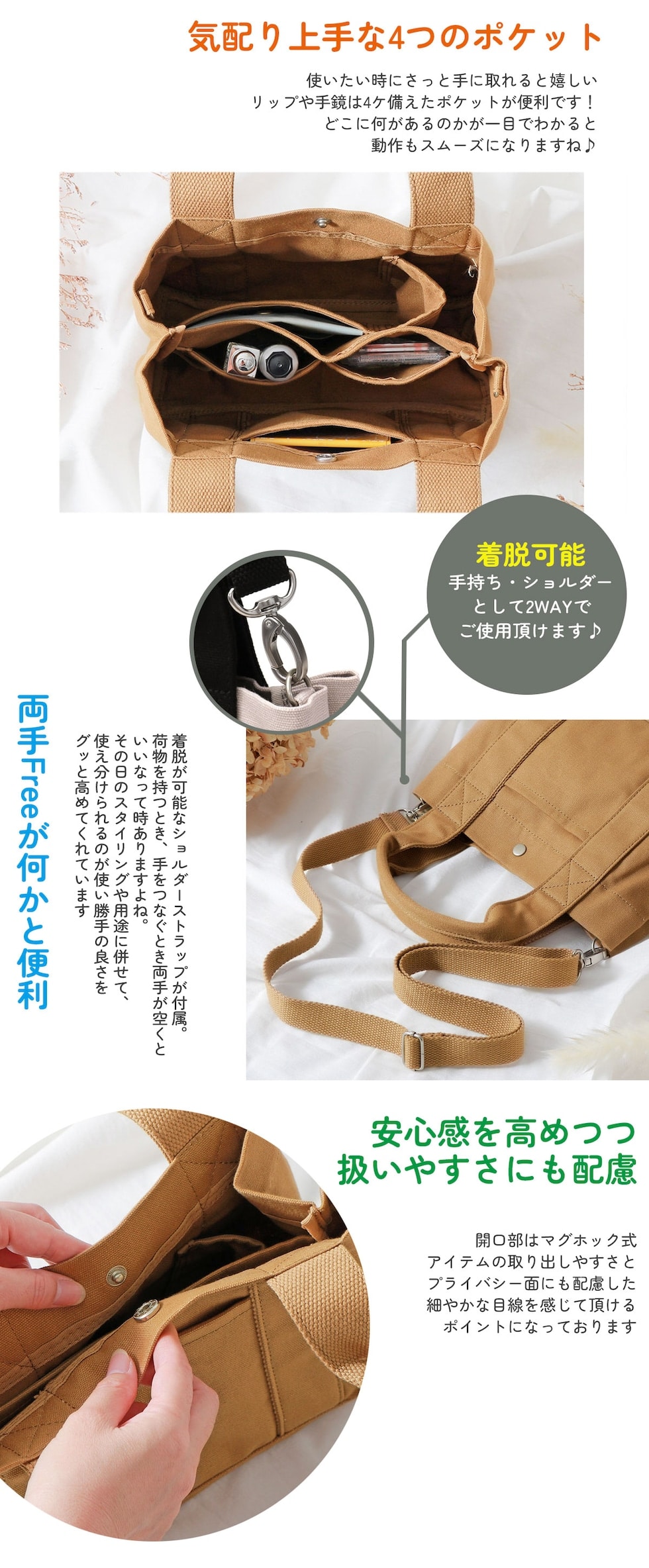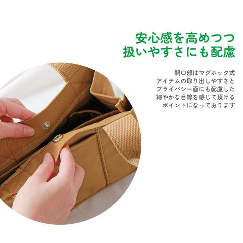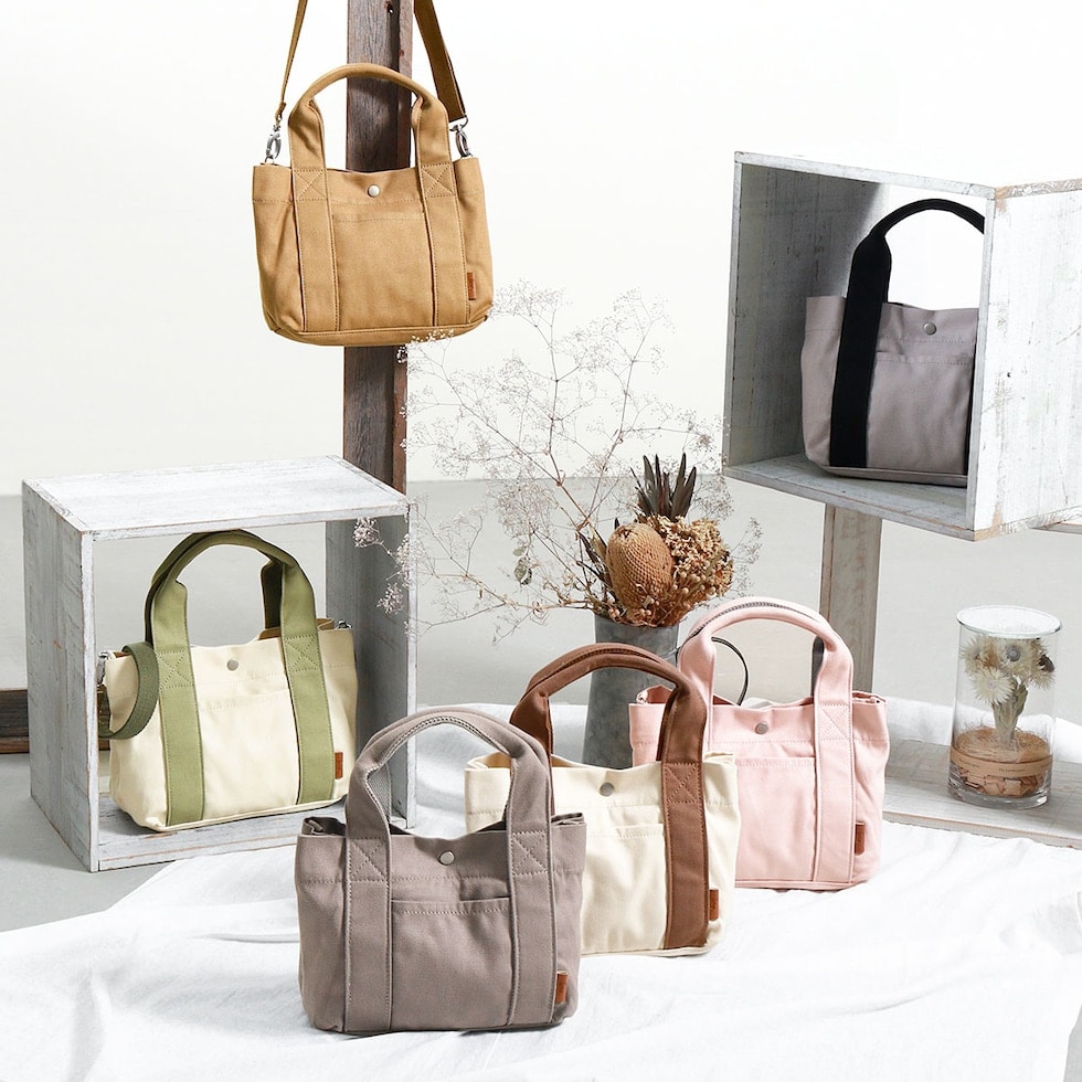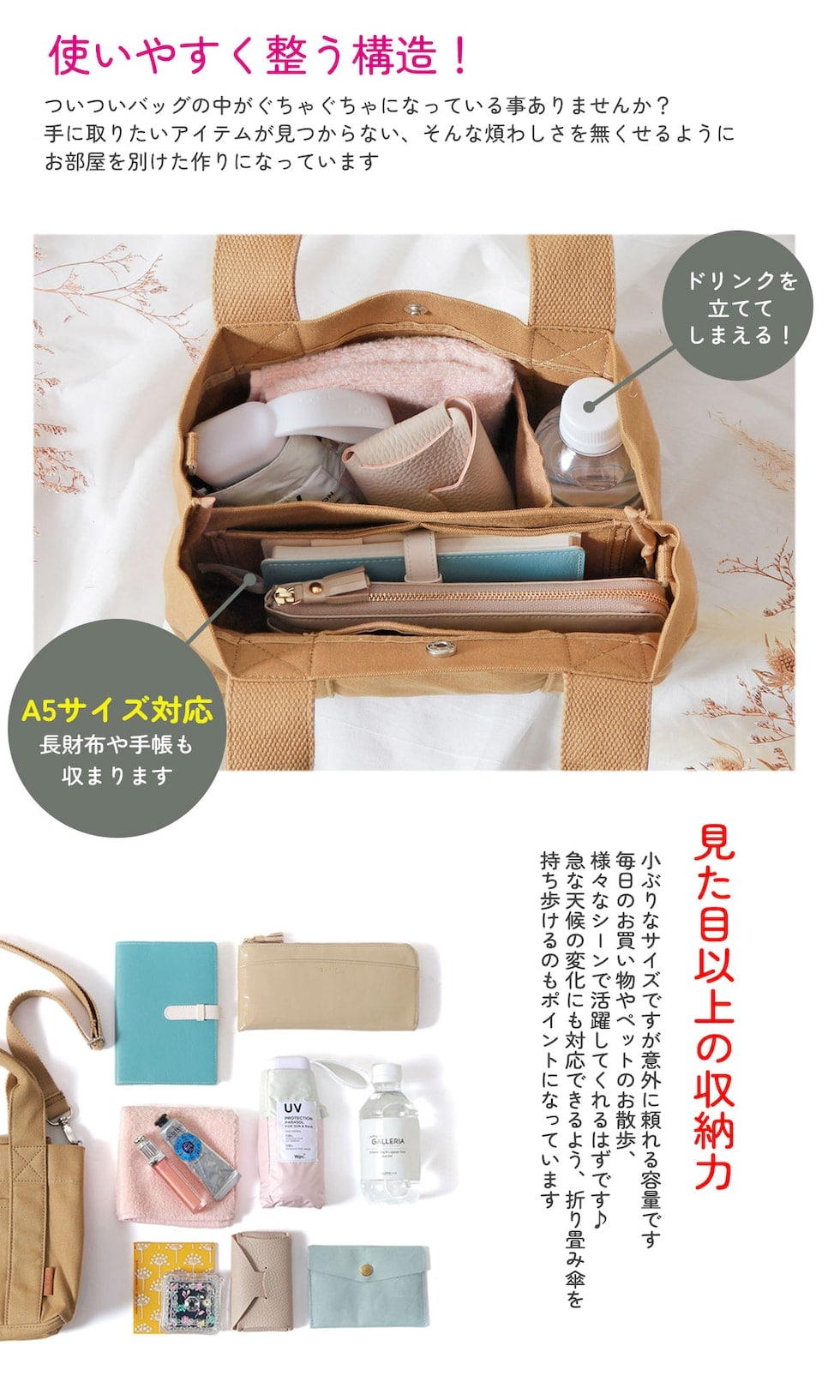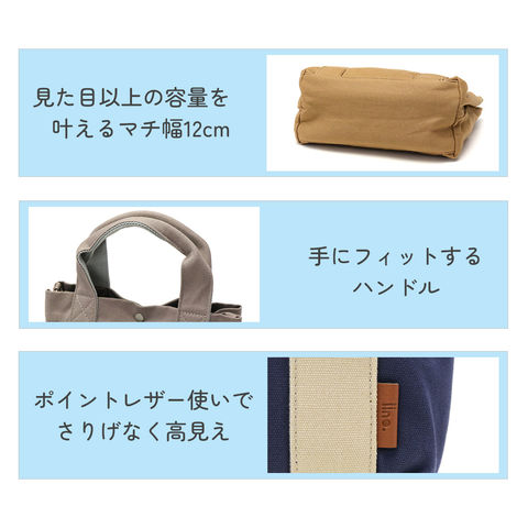 買い物やわんちゃんのお散歩など、ちょっとした外出の際にさっと持ち出せる「ちょうどいい」バッグができました。 最大のポイントはバッグの中身の仕切り。3つの部屋に分かれているので荷物が迷子になる心配もありません。 どんな服装にも馴染むように極力シンプルなデザインに仕上げました。