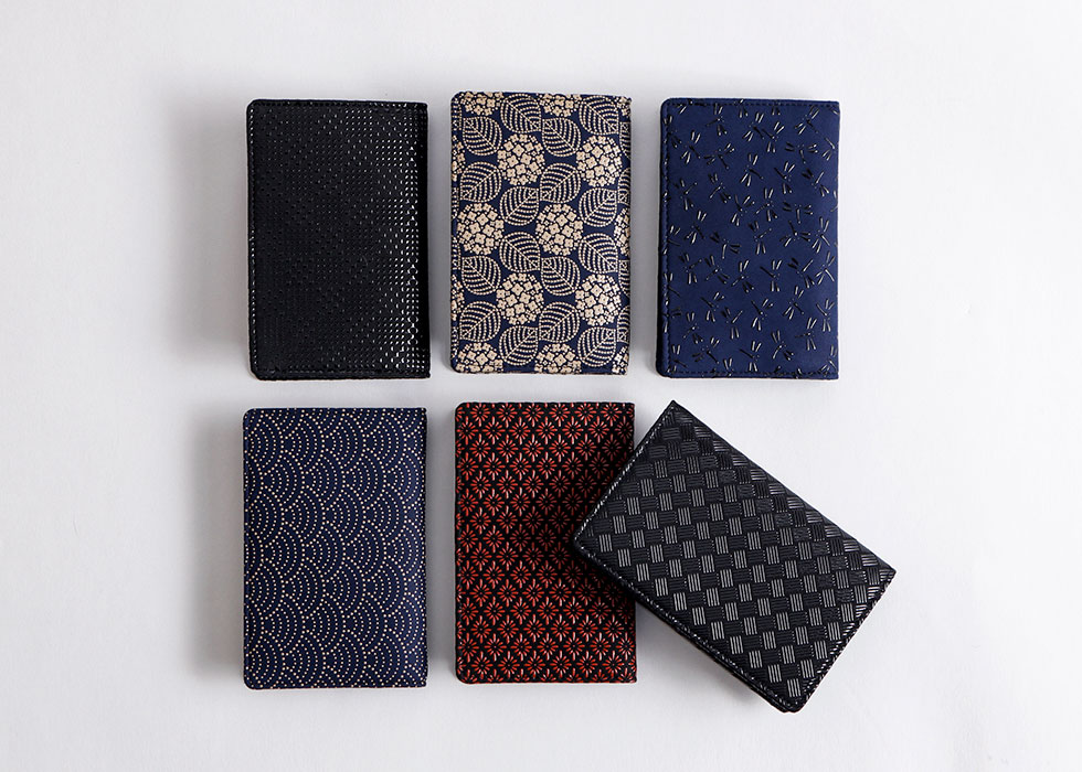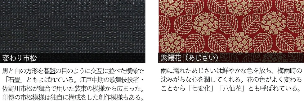 カラー|青海波(紺×白)|14-004、とんぼ(紺×黒)|4-008、菱菊(黒×赤)|21-017、網代編(黒×黒)|1-158、変わり市松小(黒×黒)|1-167、あじさい(紺×白)|14-174