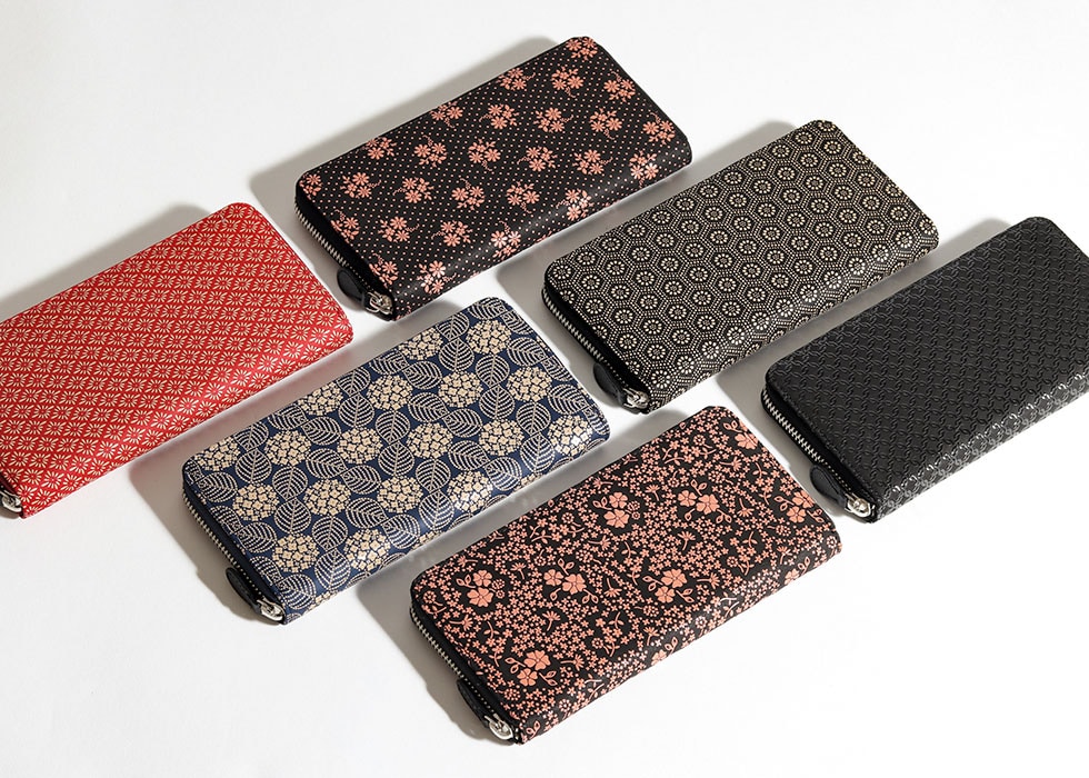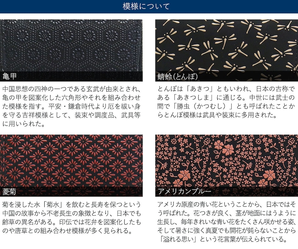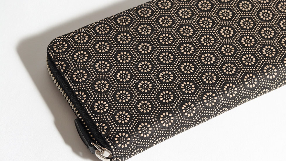 「印伝」の最大の魅力に漆により描かれる美しい柄が挙げられます。とんぼや亀甲など江戸小紋にもみられる伝統の柄が、「繊細な造形美の枠」を作りだしています。そして、永く愛用することで剥がれゆく「漆」もまた味わい深さを表現します。
