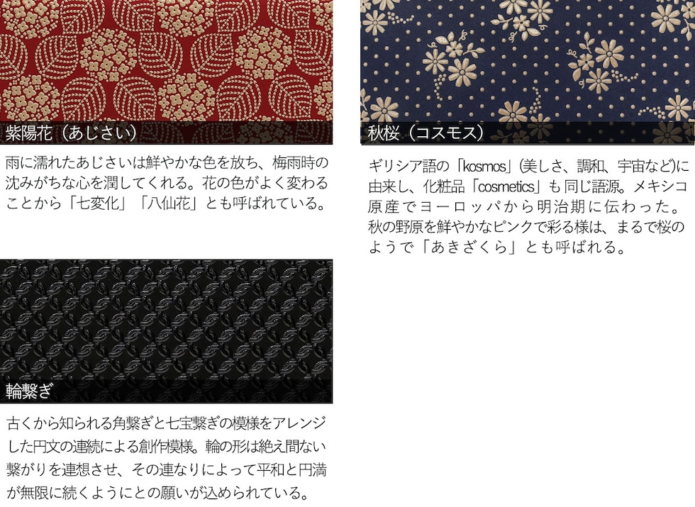 カラー|亀甲(黒×白)|11-003、とんぼ(黒×黒)|1-008、とんぼ(赤×白)|13-008、菱菊(赤×白)|13-017、アメリカンブルー(黒×ピンク)|51-166、あじさい(紺×白)|14-174、コスモス(黒×ピンク)|51-175、輪繋ぎ(黒×黒)|1-177