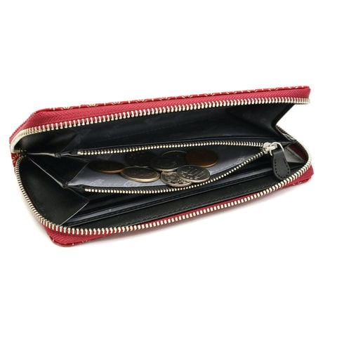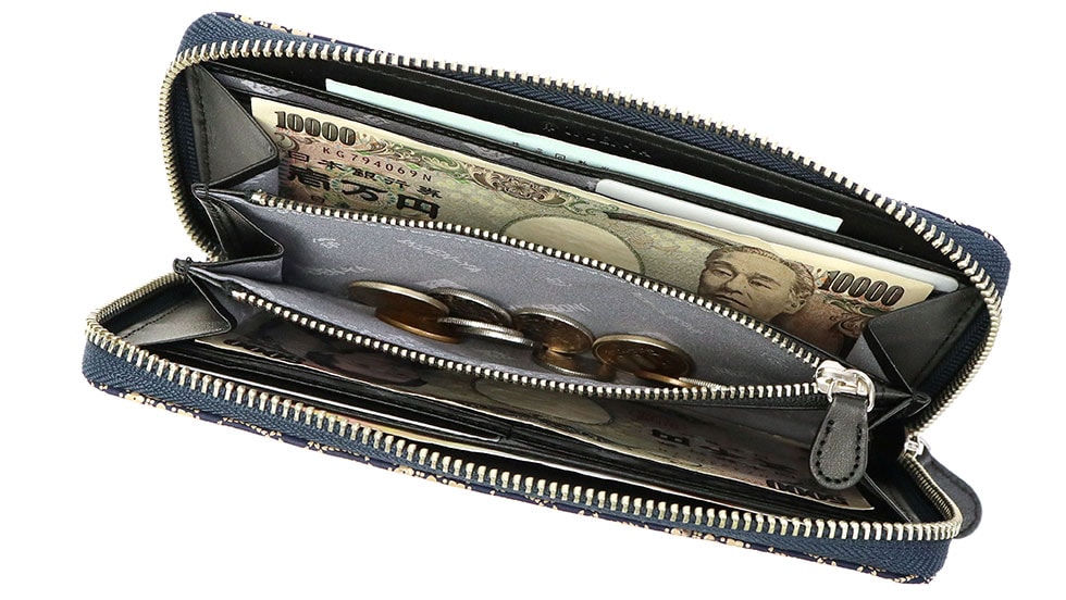 収納部はお札や小銭、カードのすべてを収納できるベーシックなデザイン。ポケットの数や厚みを必要な分のみ備えたつくりで、大きく膨らむのを抑え、お財布の厚みを気にすることなくご使用いただけます。職人が生み出した美しい柄がさりげなく持つ人のこだわりを感じさせ、手元を特別感のあるものへと彩る逸品です。