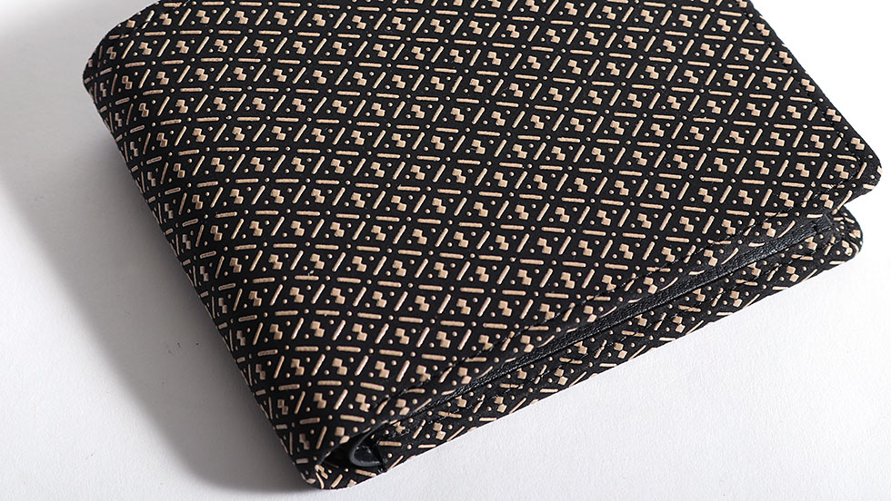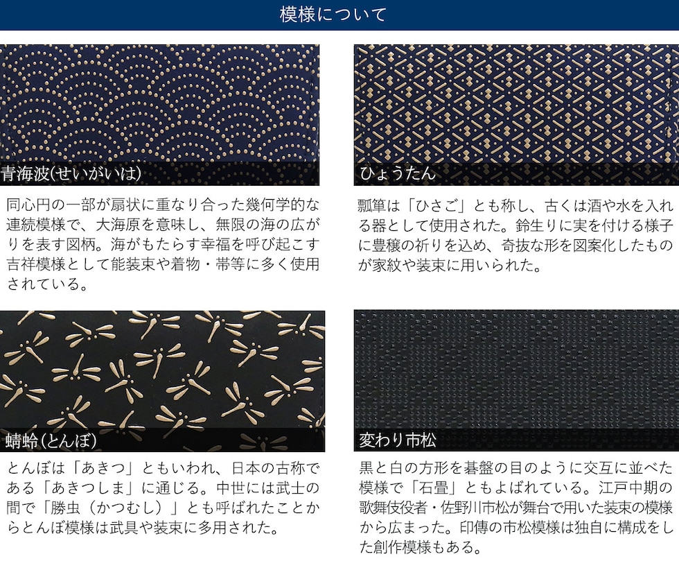 「印伝」の最大の魅力に漆により描かれる美しい柄が挙げられます。青海波やとんぼ、市松など江戸小紋にもみられる伝統の柄が、「繊細な造形美の枠」を作りだしています。そして、永く愛用することで剥がれゆく「漆」もまた味わい深さを表現します。