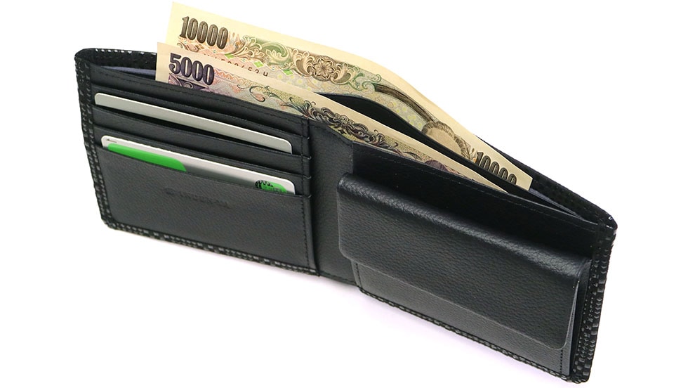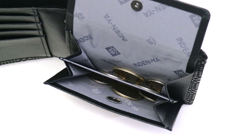 収納部はお札、小銭、カードが効率よく収まる、ベーシックなデザイン。お札入れは2ヶ所設けられ、紙幣を金額別に分けて収納することが可能です。また、小銭入れ内にも中仕切りを設け使い勝手の良さを感じていただける仕上がりになっています。甲州に四百年もの長い年月受け継がれる心、その脈々と受け継がれる職人の技と心が生み出す伝統美を手に取って味わっていただけます。