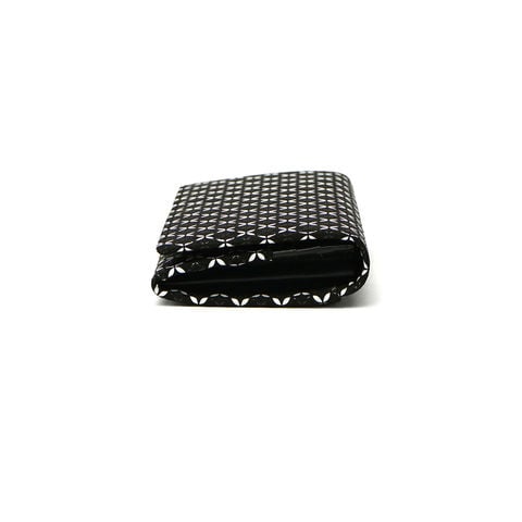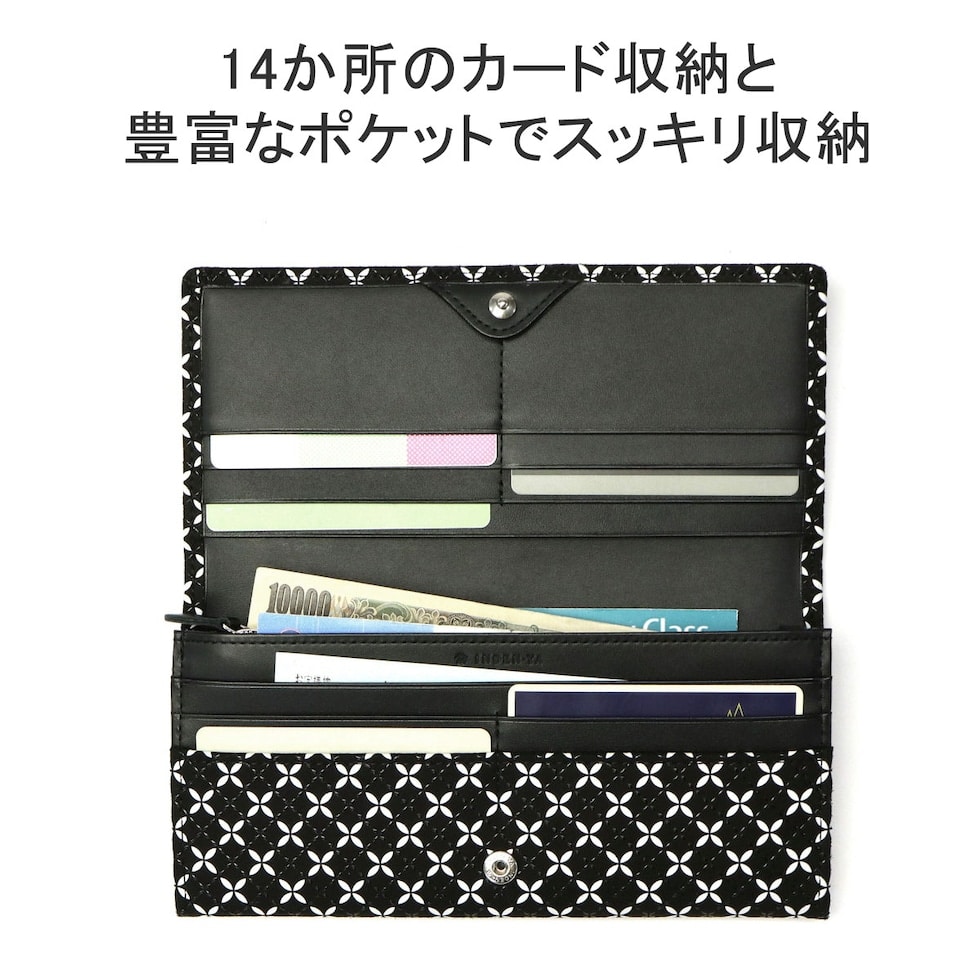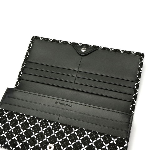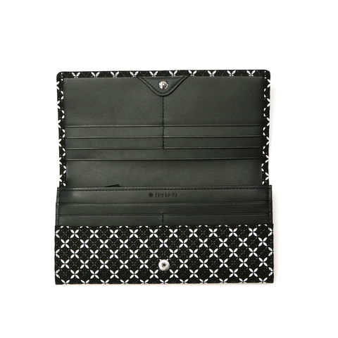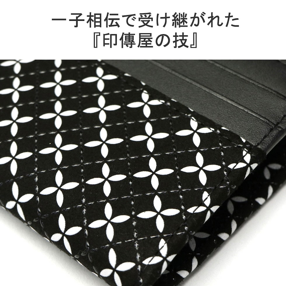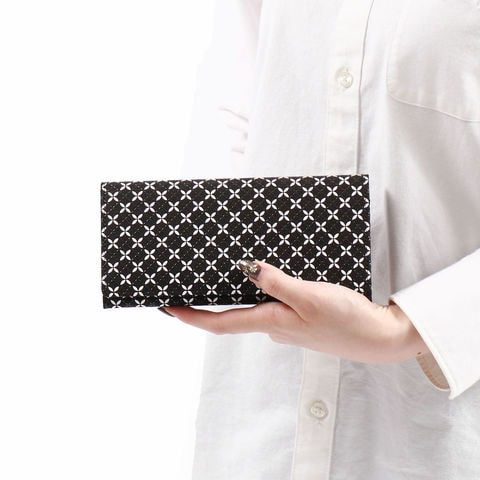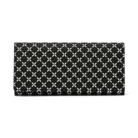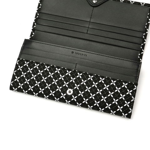 柔らかな鹿革の風合いに、漆柄が魅力の革工芸「印伝」のかぶせタイプの長財布です。こちらの「そよか」は、軽やかで気の向くままに進んでいく“そよ風”をイメージしたシリーズ。幸せや縁が広がる模様として親しまれる七宝をつなげて、白更紗と黒漆のコントラストで描き、調和によって生まれるかたちを際立たせました。ポケットが充実した大容量なつくりで、お札や多数のカードを仕分けて持ち歩きたい方におすすめです。