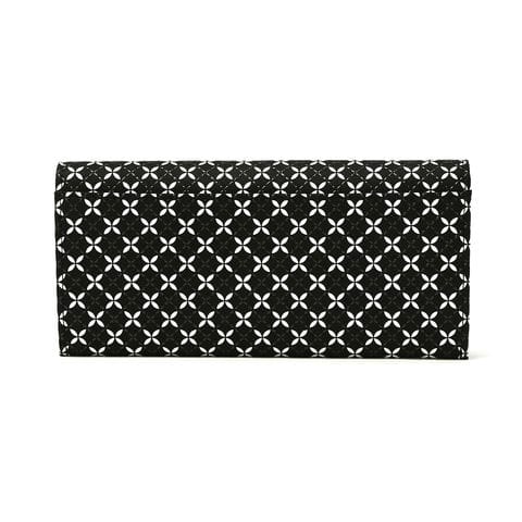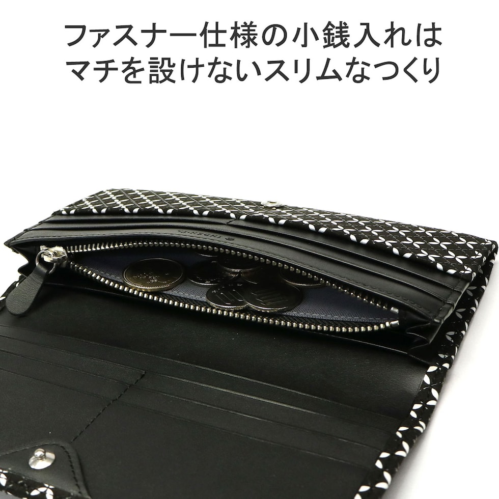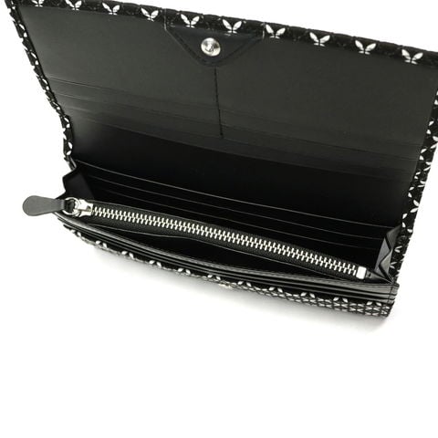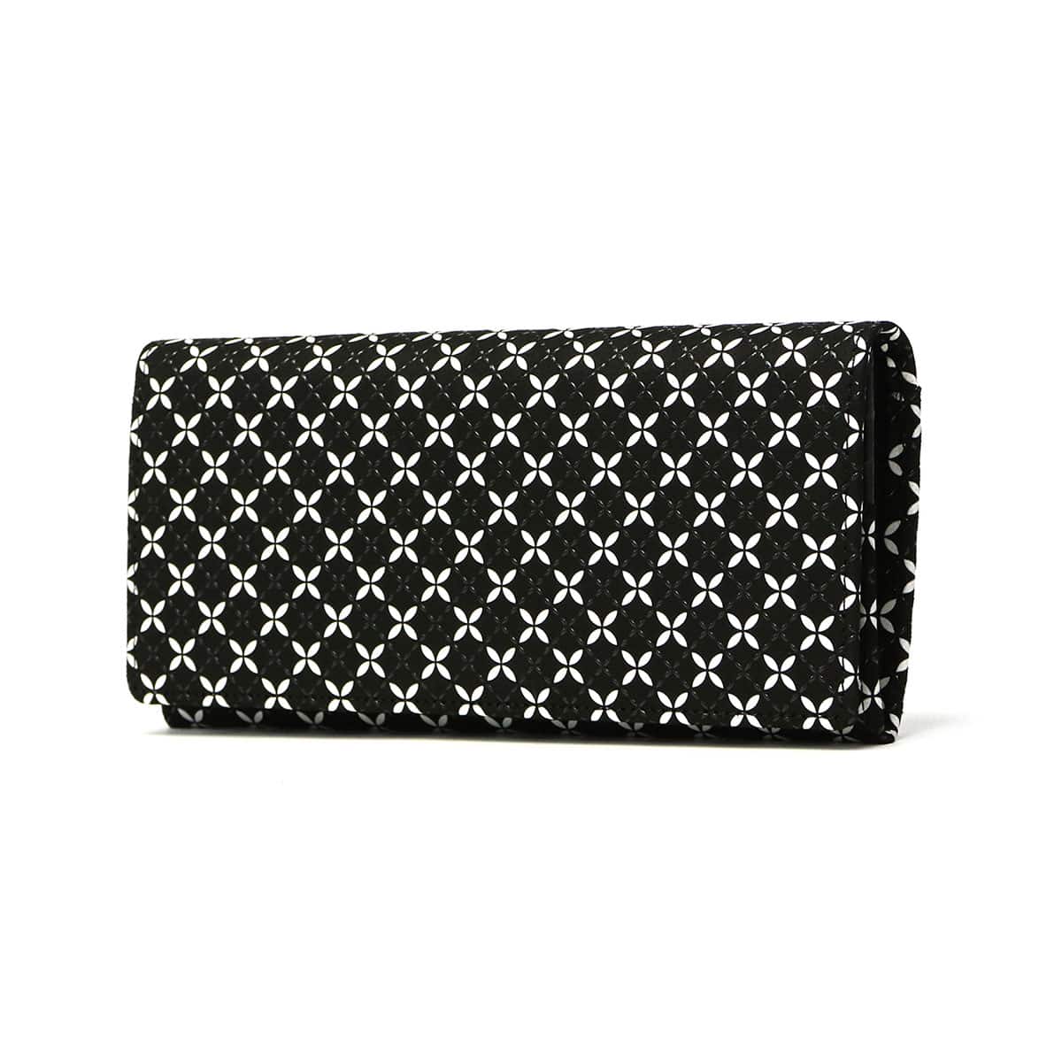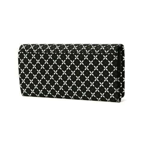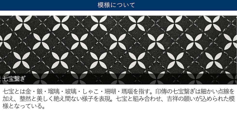 柔らかな鹿革の風合いに、漆柄が魅力の革工芸「印伝」のかぶせタイプの長財布です。こちらの「そよか」は、軽やかで気の向くままに進んでいく“そよ風”をイメージしたシリーズ。幸せや縁が広がる模様として親しまれる七宝をつなげて、白更紗と黒漆のコントラストで描き、調和によって生まれるかたちを際立たせました。ポケットが充実した大容量なつくりで、お札や多数のカードを仕分けて持ち歩きたい方におすすめです。