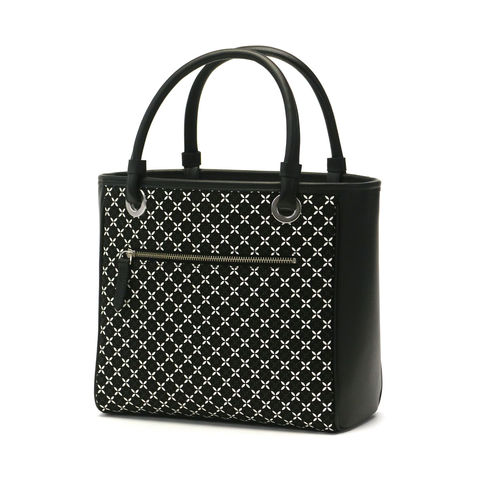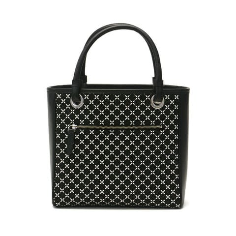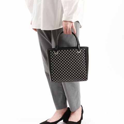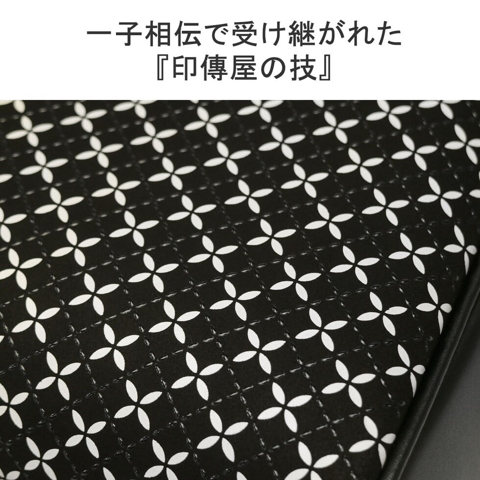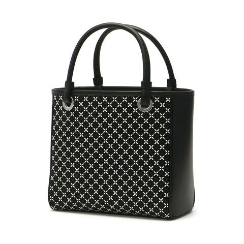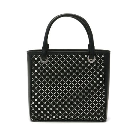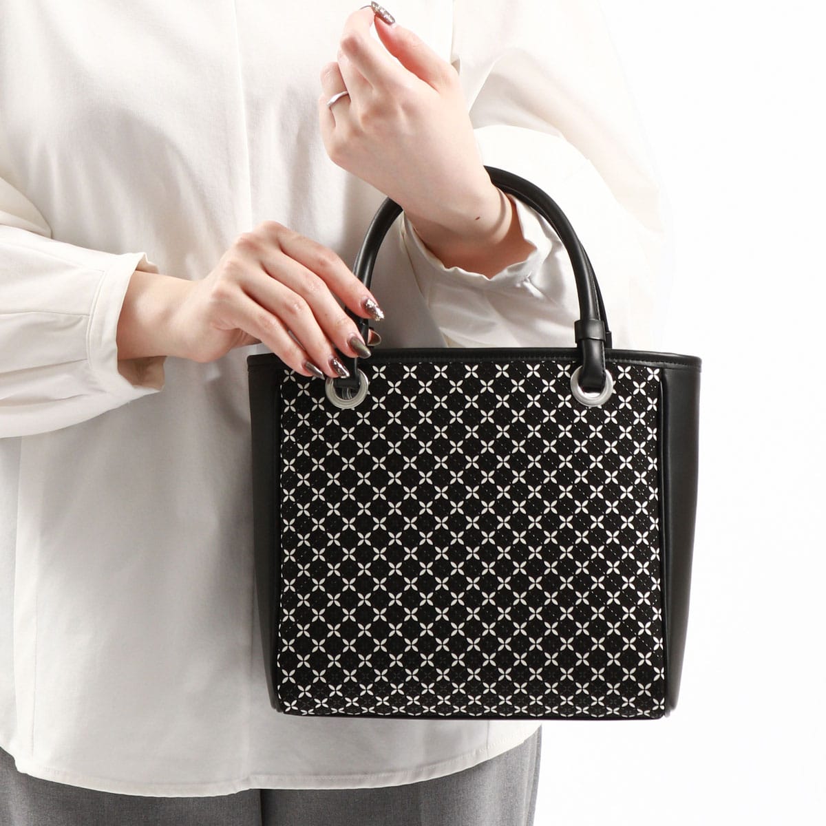 柔らかな鹿革の風合いに、漆柄が魅力の革工芸「印伝」の手提げバッグです。こちらの「そよか」は、軽やかで気の向くままに進んでいく“そよ風”をイメージしたシリーズ。幸せや縁が広がる模様として親しまれる七宝をつなげて、白更紗と黒漆のコントラストで描き、調和によって生まれるかたちを際立たせました。底マチを広く設けた本体は、お出かけに必要なアイテムが十分に入るサイズ感。しっかりと自立し、端正な印象を与えるスクエアフォルムは、いつもの装いにきちんと感をプラスしてくれます。
