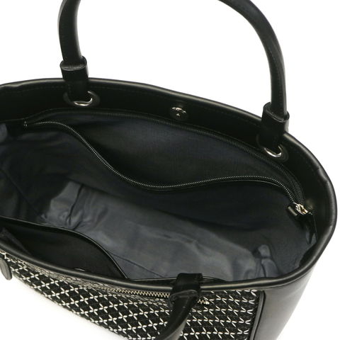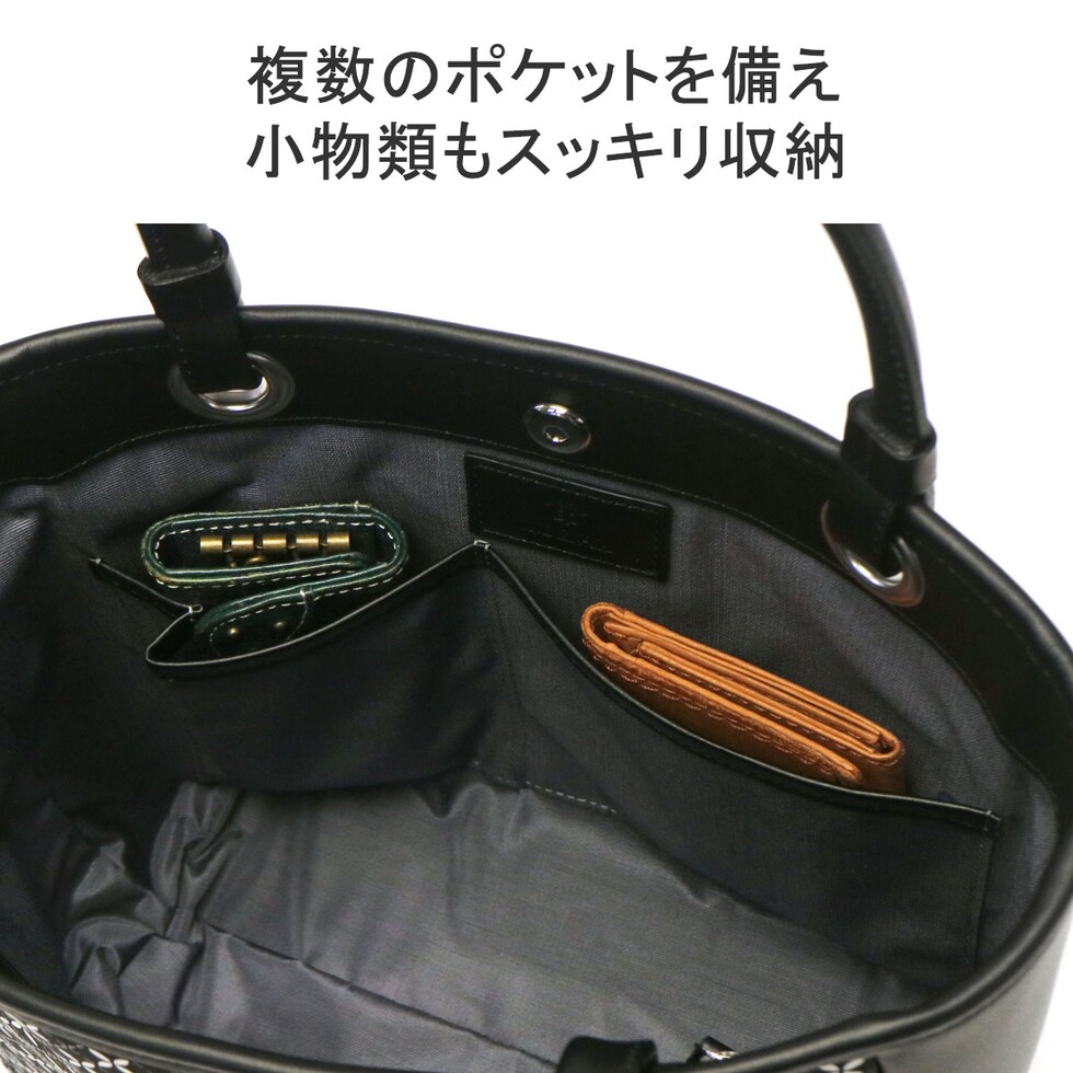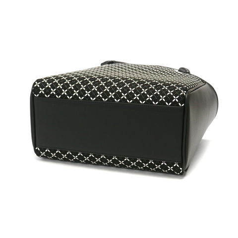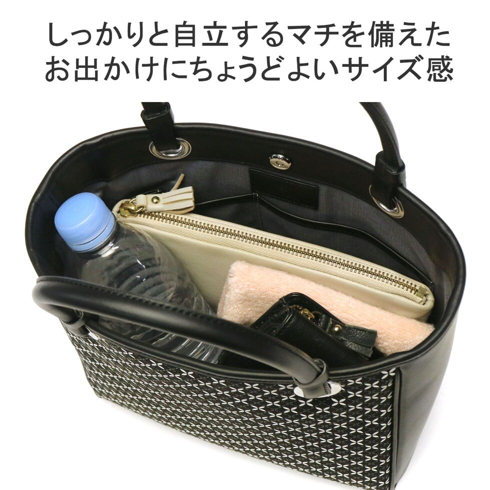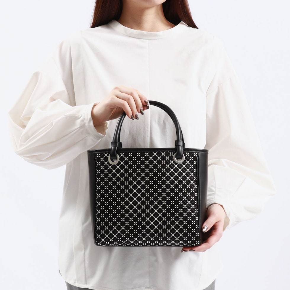 柔らかな鹿革の風合いに、漆柄が魅力の革工芸「印伝」の手提げバッグです。こちらの「そよか」は、軽やかで気の向くままに進んでいく“そよ風”をイメージしたシリーズ。幸せや縁が広がる模様として親しまれる七宝をつなげて、白更紗と黒漆のコントラストで描き、調和によって生まれるかたちを際立たせました。底マチを広く設けた本体は、お出かけに必要なアイテムが十分に入るサイズ感。しっかりと自立し、端正な印象を与えるスクエアフォルムは、いつもの装いにきちんと感をプラスしてくれます。