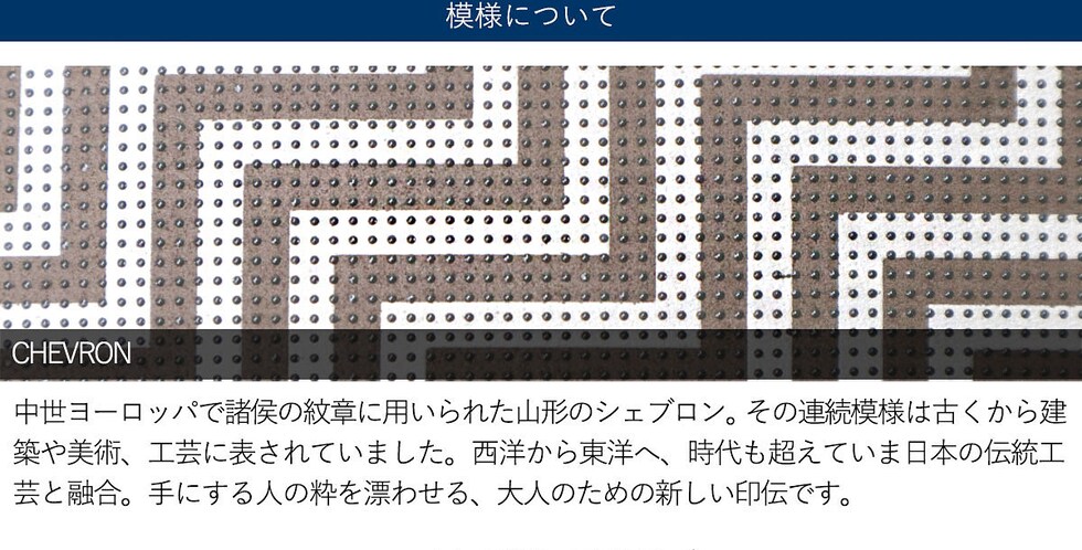 中世ヨーロッパで諸侯の紋章に用いられた山型のシェブロン。その連続模様は古くから建築や美術、工芸に表されました。西洋から東洋へ、時代も越えていま日本の伝統工芸と融合。手にする人の粋を漂わせる、大人のための新しい印伝の登場です。落ち着きのある色調で構成された幾何学模様のシェブロンは、オンオフ関わらず様々なスタイリングに調和しながら、大人の香気をほどよく添えます。