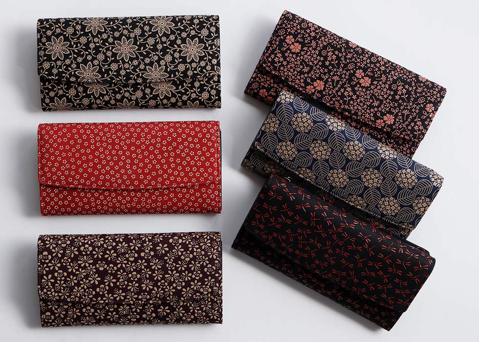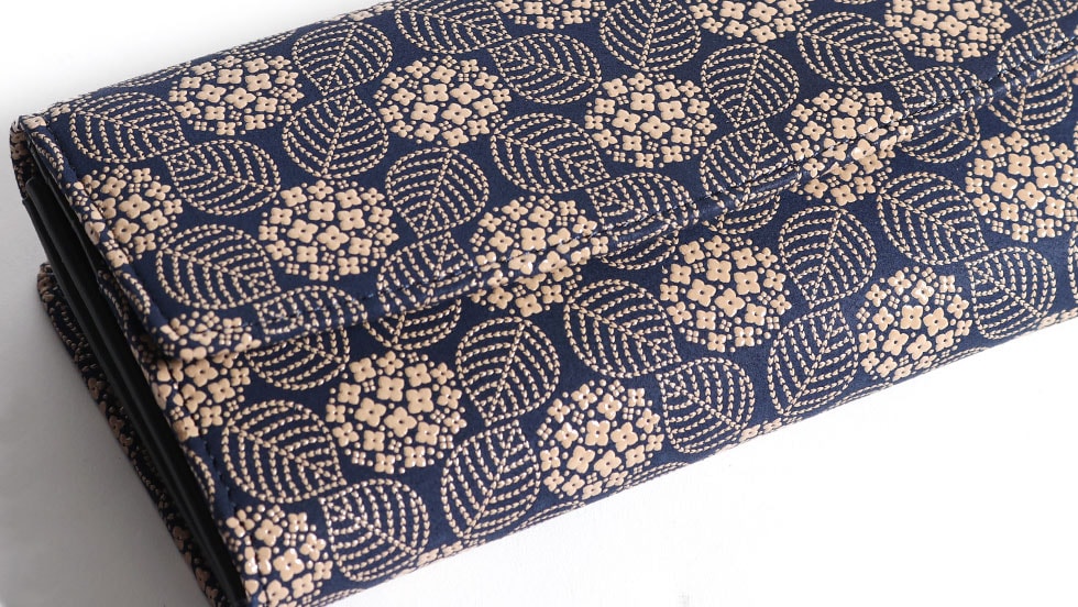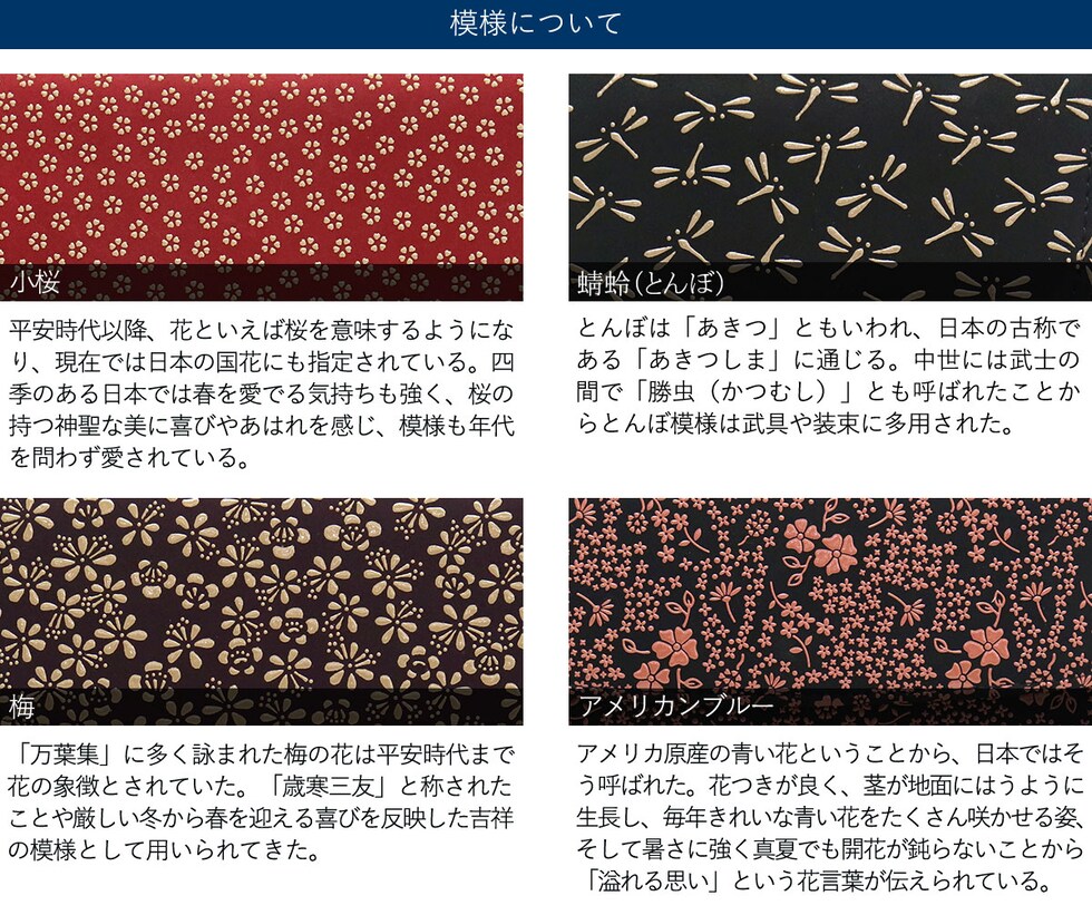 「印伝」の最大の魅力に漆により描かれる美しい柄が挙げられます。小桜やとんぼ、梅など江戸小紋にもみられる伝統の柄が、「繊細な造形美の枠」を作りだしています。そして、永く愛用することで剥がれゆく「漆」もまた味わい深さを表現します。