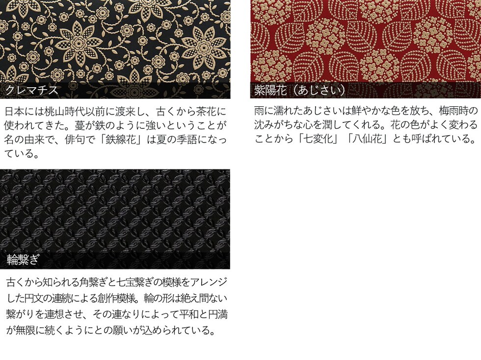 カラー|小桜(赤×白)|13-002、とんぼ(黒×赤)|21-008、梅(紫×白)|16-148、アメリカンブルー(紺×白)|14-166、アメリカンブルー(黒×ピンク)|51-166、クレマチス(黒×白)|11-169、あじさい(赤×白)|13-174、あじさい(赤×白)|14-174、輪繋ぎ極小(紺×白)|14、輪繋ぎ極小(紺×赤)|24