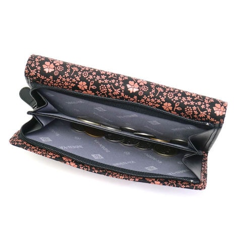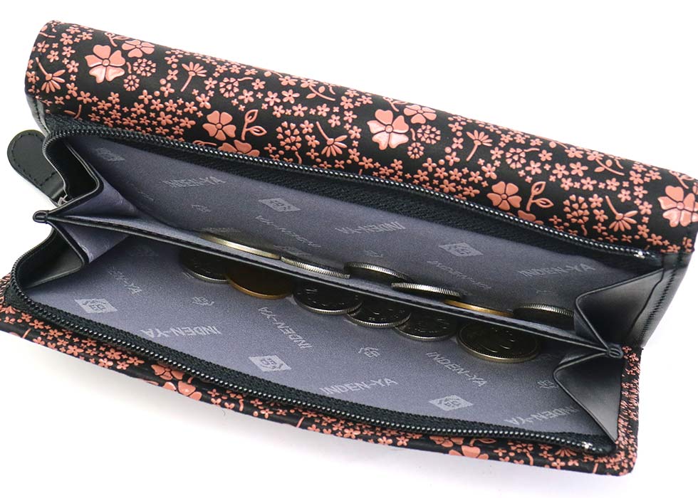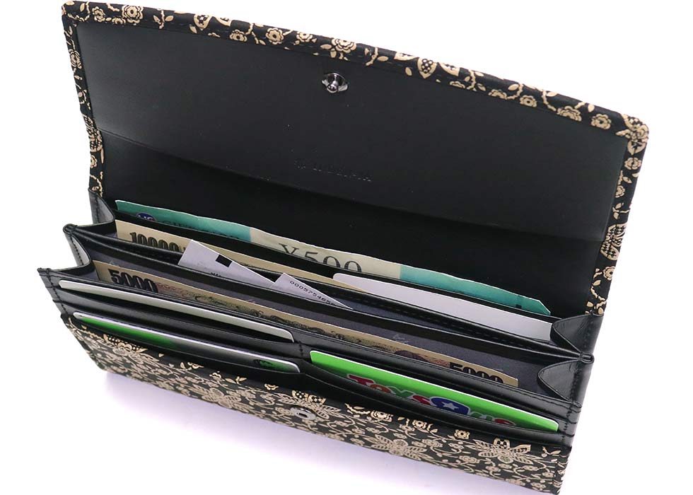 フラップタイプの収納部には内部に2ヶのお札入れと、12ヶのカードポケット、領収書などの収納に便利なポケットを備えています。外側にはたっぷり収まる小銭入れを設けており、収納力を高めています。甲州に四百年もの長い年月受け継がれる心、その脈々と受け継がれる職人の技と心が生み出す伝統美を手に取って味わっていただけます。