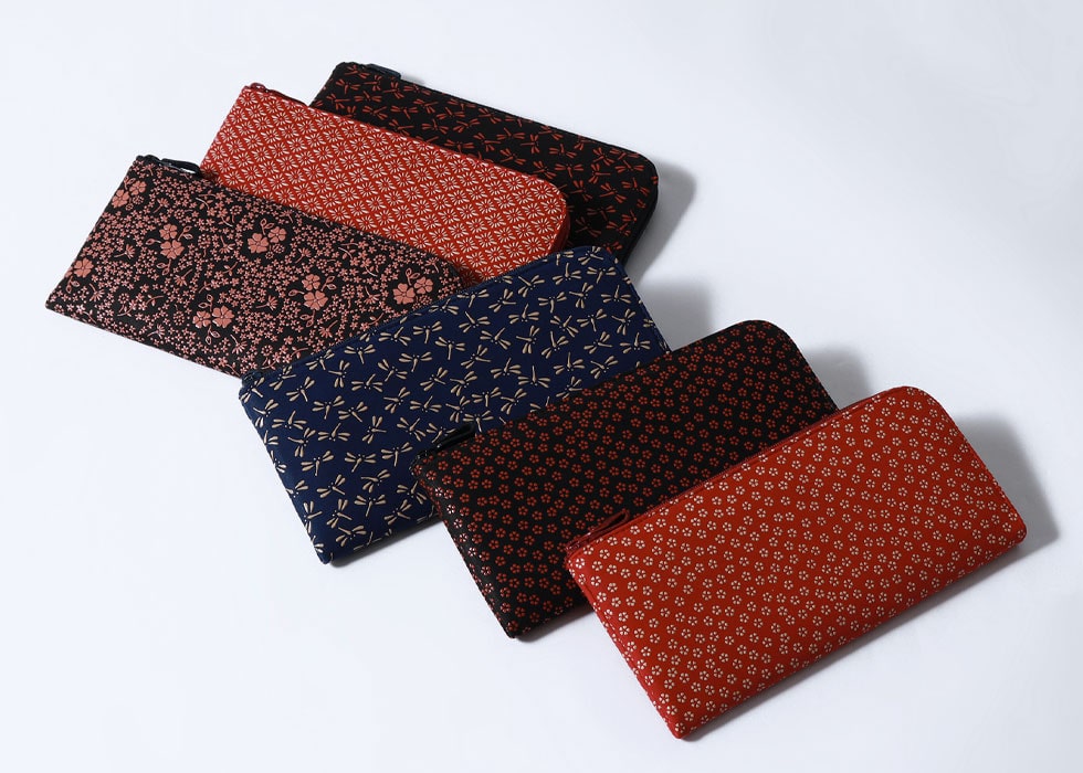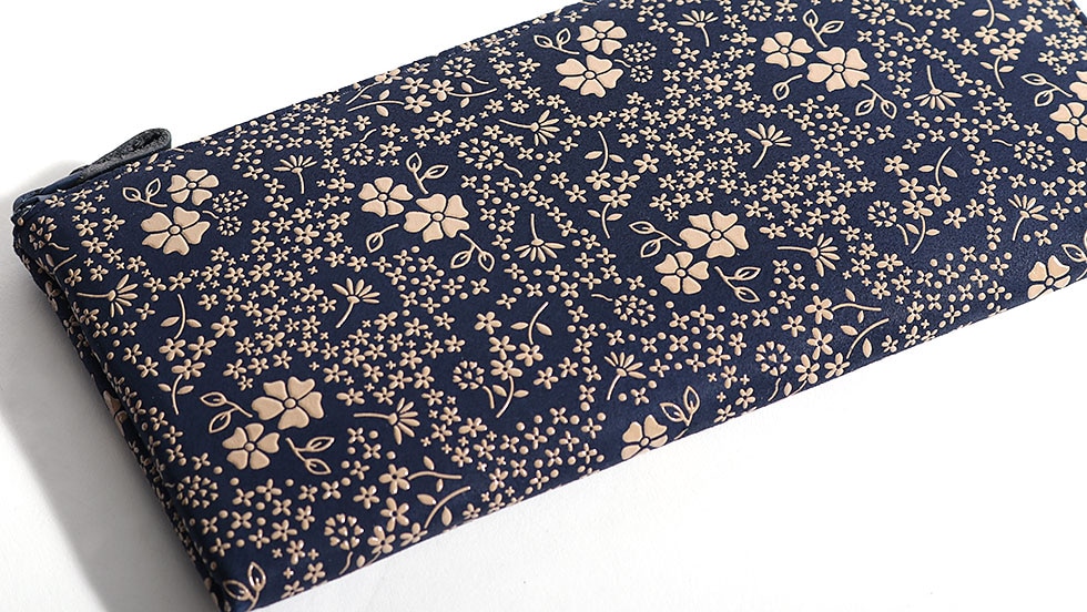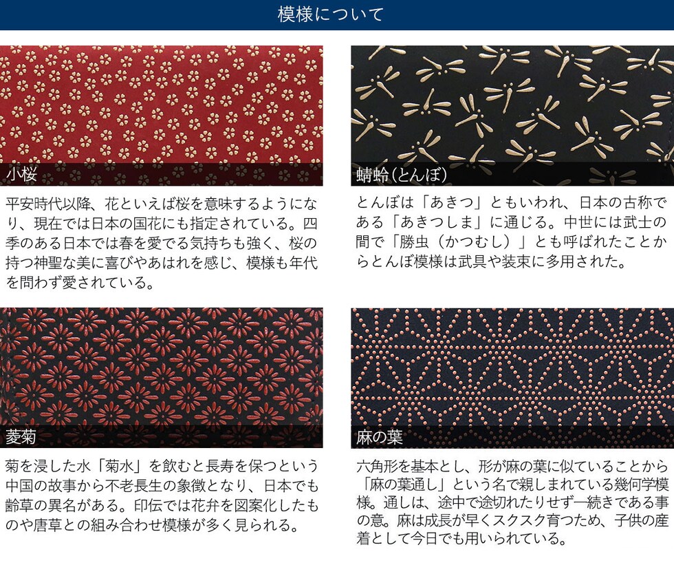 「印伝」の最大の魅力に漆により描かれる美しい柄が挙げられます。小桜やとんぼ、市松など江戸小紋にもみられる伝統の柄が、「繊細な造形美の枠」を作りだしています。そして、永く愛用することで剥がれゆく「漆」もまた味わい深さを表現します。