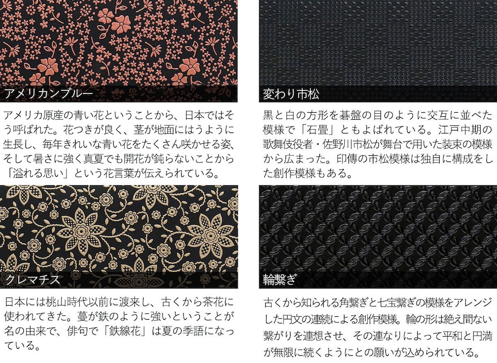 カラー|小桜(赤×白)|13-002、小桜(黒×赤)|21-002、とんぼ(紺×白)|14-008、とんぼ(黒×赤)|21-008、とんぼ(紺×ピンク)|54-008、とんぼ(すみれ×ピンク)|300-008、菱菊(赤×白)|13-017、麻の葉(紺×ピンク)|54-136、アメリカンブルー(紺×白)|14-166、アメリカンブルー(黒×ピンク)|51-166、変わり市松小(黒×黒)|1-167、クレマチス(すみれ×黒)|100-169、クレマチス(すみれ×白)|200-169、輪繋ぎ小(すみれ×黒)|100-177