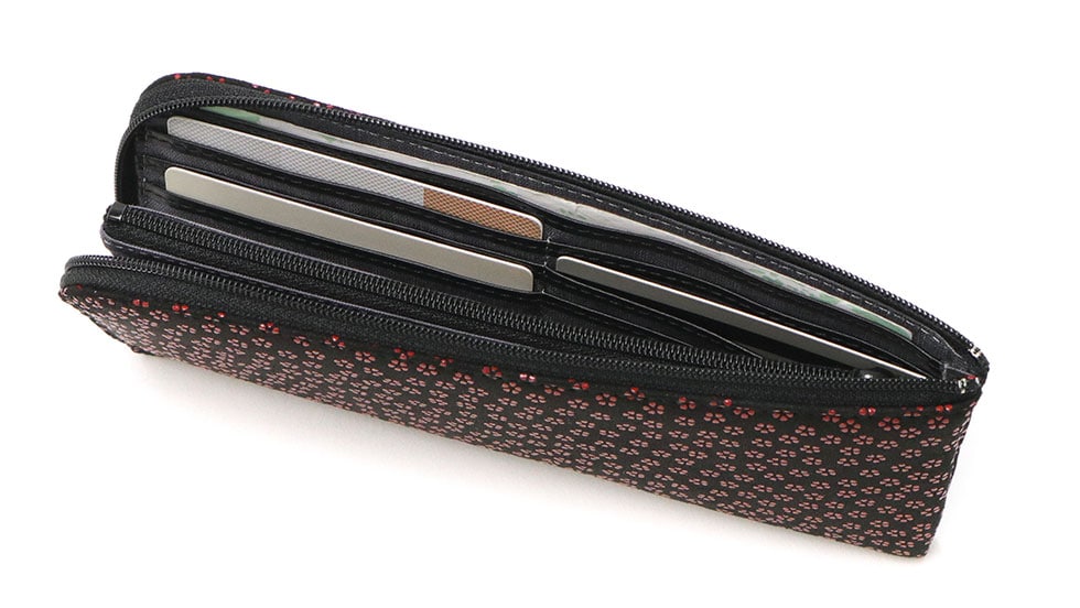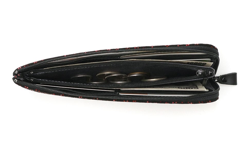 収納部はL字ファスナータイプで視認性に優れ、アイテムの取り出しもスムーズに行えます。中央に設けられた小銭入れの両サイドはお札の収納に便利なスペースとなっています。さらに、カードポケットを12ヶ、領収書の管理に便利なポケットを2ヶ設けています。甲州に四百年もの長い年月受け継がれる心、その脈々と受け継がれる職人の技と心が生み出す伝統美を手に取って味わっていただけます。