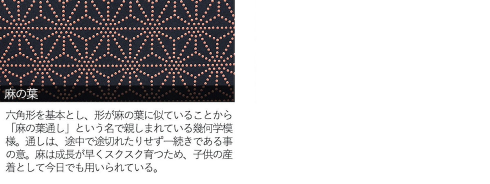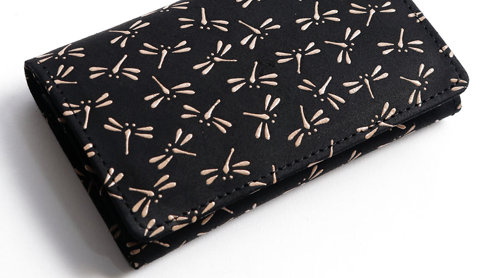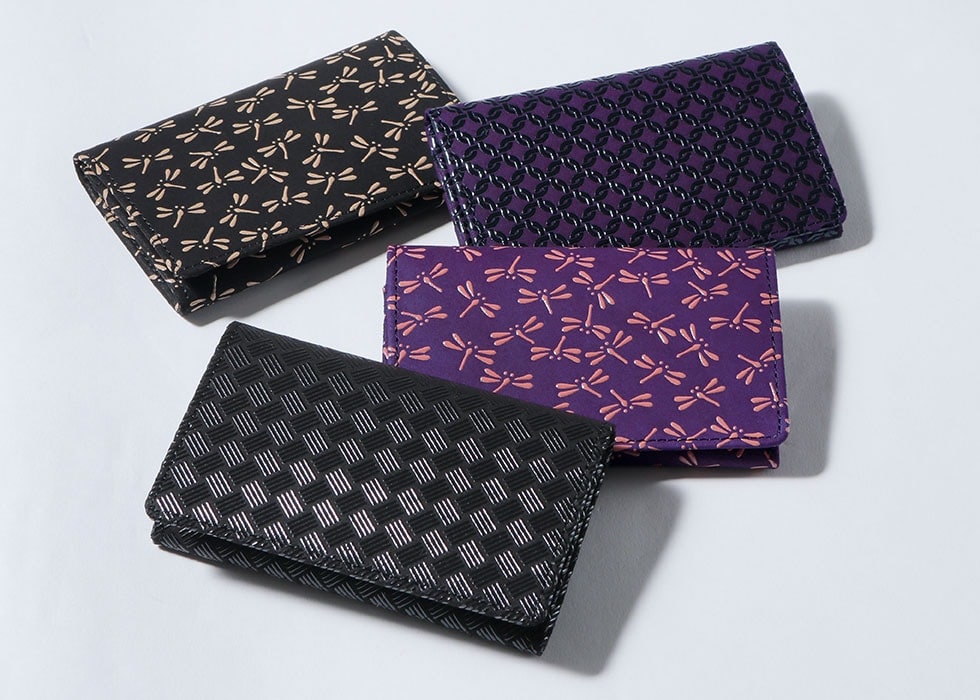 「印伝」の最大の魅力に漆により描かれる美しい柄が挙げられます。とんぼや網代編、市松など江戸小紋にもみられる伝統の柄が、「繊細な造形美の枠」を作りだしています。そして、永く愛用することで剥がれゆく「漆」もまた味わい深さを表現します。