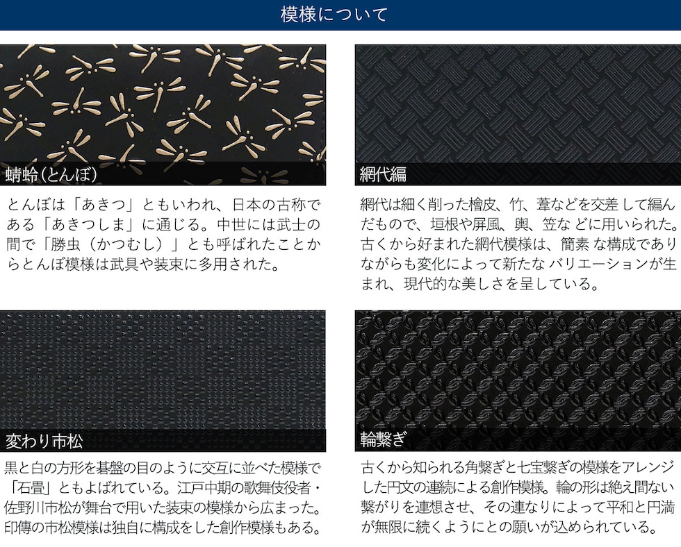 カラー|とんぼ(黒×黒)|1-008、とんぼ(黒×白)|11-008、とんぼ(すみれ×ピンク)|300-008、網代編(黒×黒)|1-158、変わり市松小(黒×黒)|1-167、変わり市松小 (紺×黒)|4-167、輪繋ぎ小(すみれ×黒)|100-177