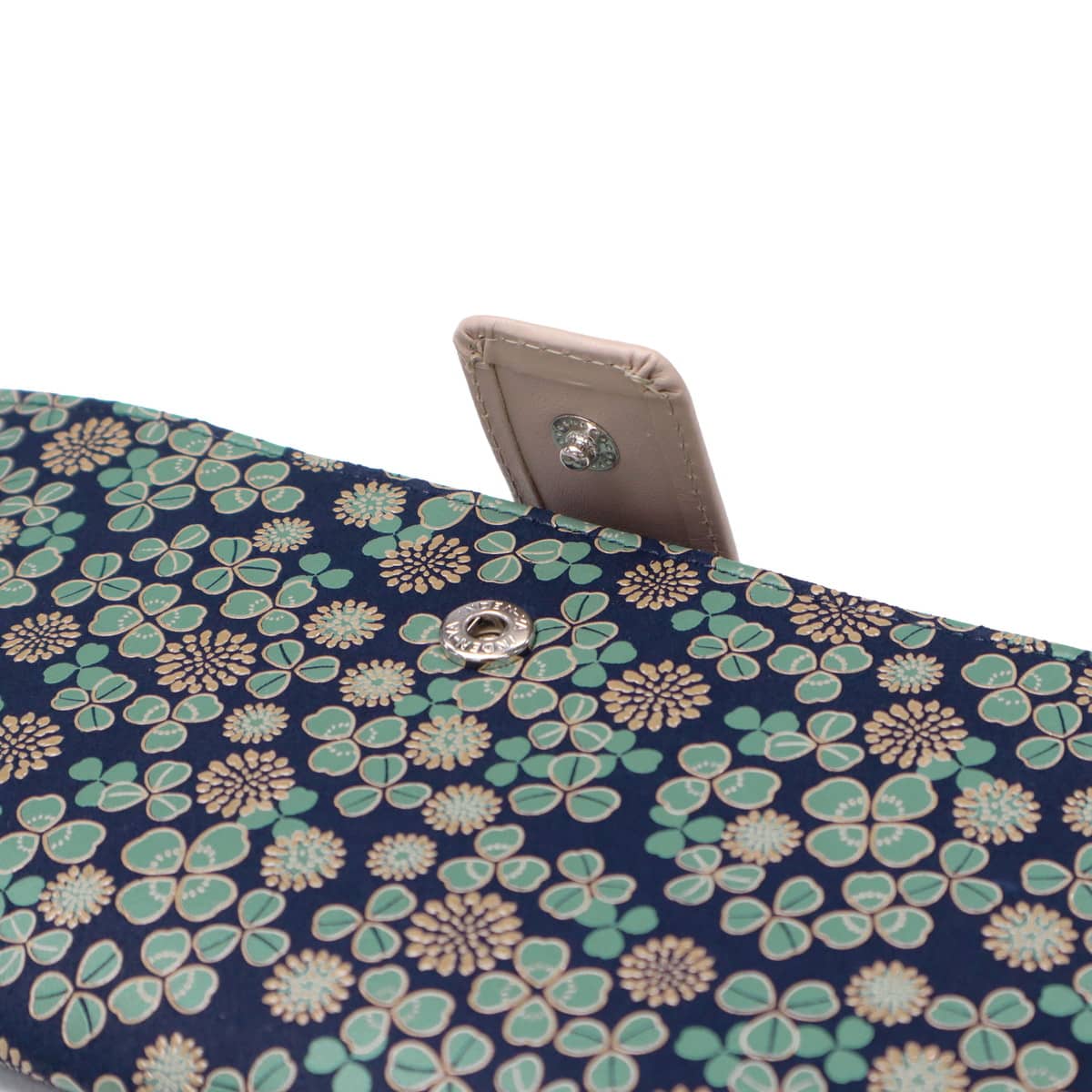 紺色の鹿革に、三つ葉とこんもりした花をパステルグリーンの更紗と白漆で表現した印傳屋オリジナル『白詰草』の二つ折り財布。敷き詰めた葉の中には、幸運を象徴する四つ葉が隠れています。包まれると、ほっと嬉しくなる素朴な野花をモチーフに、ちょっと心地いい気分になれるアイテムをつくりました。