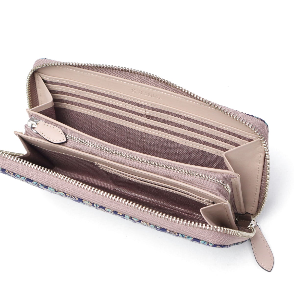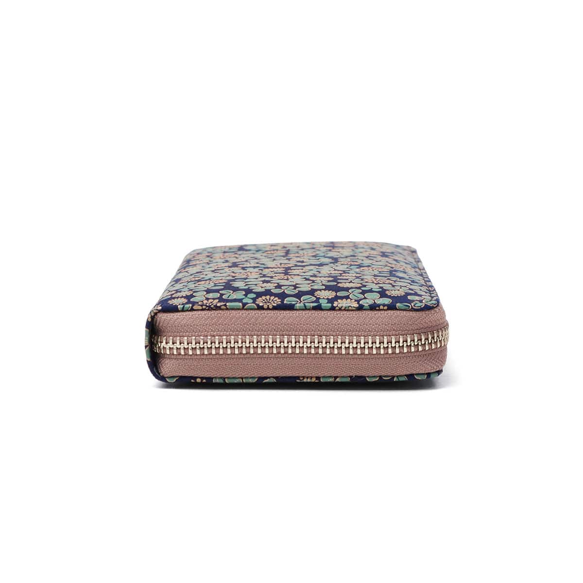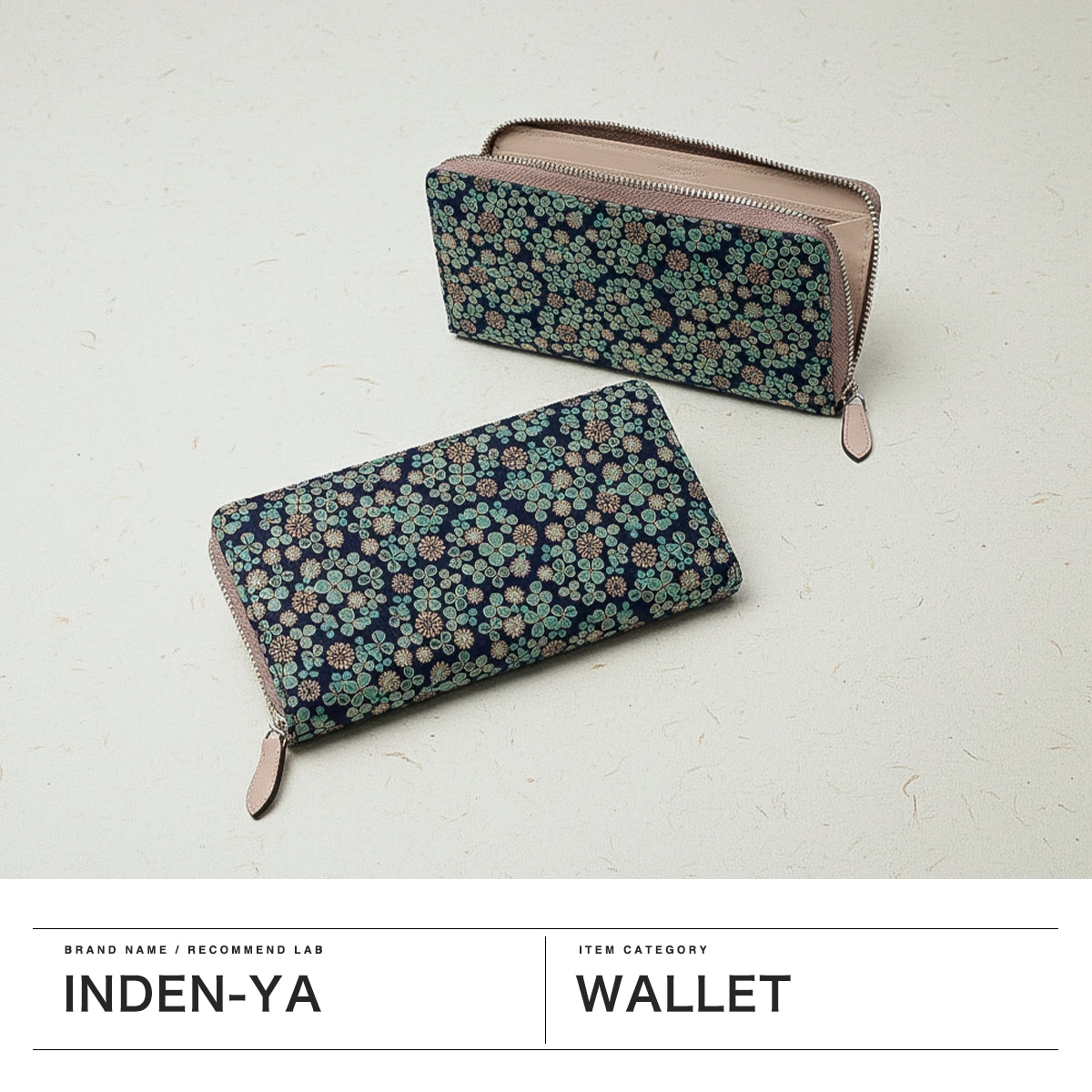 紺色の鹿革に、三つ葉とこんもりした花をパステルグリーンの更紗と白漆で表現した印傳屋オリジナル『白詰草』の二つ折り財布。敷き詰めた葉の中には、幸運を象徴する四つ葉が隠れています。包まれると、ほっと嬉しくなる素朴な野花をモチーフに、ちょっと心地いい気分になれるアイテムをつくりました。