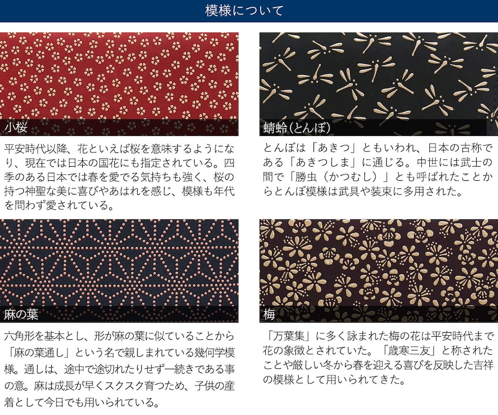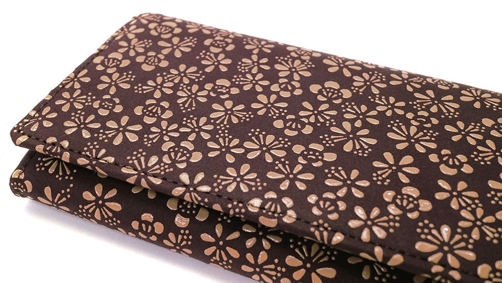 「印伝」の最大の魅力に漆により描かれる美しい柄が挙げられます。小桜やとんぼ、梅など江戸小紋にもみられる伝統の柄が、「繊細な造形美の枠」を作りだしています。そして、永く愛用することで剥がれゆく「漆」もまた味わい深さを表現します。