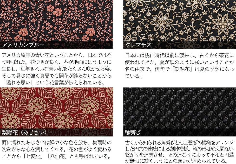 カラー|小桜(赤×白)|13-002、とんぼ(黒×赤)|21-008、とんぼ(紺×ピンク)|54-008、とんぼ(すみれ×ピンク)|300-008、麻の葉(紺×ピンク)|54-136、梅(紫×白)|16-148、アメリカンブルー(紺×白)|14-166、アメリカンブルー(黒×ピンク)|51-166、クレマチス(黒×白)|11-169、クレマチス(すみれ×黒)|100-169、クレマチス(すみれ×白)|200-169、あじさい(赤×白)|13-174、あじさい(紺×白)|14-174、輪繋ぎ小(すみれ×黒)|100-177