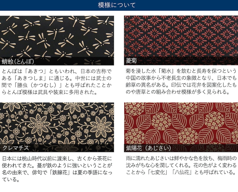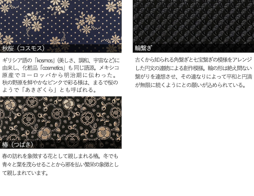 カラー|とんぼ(赤×白)|13-008、とんぼ(紺×白)|14-008、とんぼ(黒×赤)|21-008、とんぼ(すみれ×ピンク)|300-008、菱菊(赤×白)|13-017、クレマチス(すみれ×黒)|100-169、クレマチス(すみれ×白)|200-169、あじさい(紺×白)|14-174、コスモス(紺×白)|14-175、輪繋ぎ小(黒×黒)|1-177、輪繋ぎ小(すみれ×黒)|100-177、椿(黒×白)|11-178