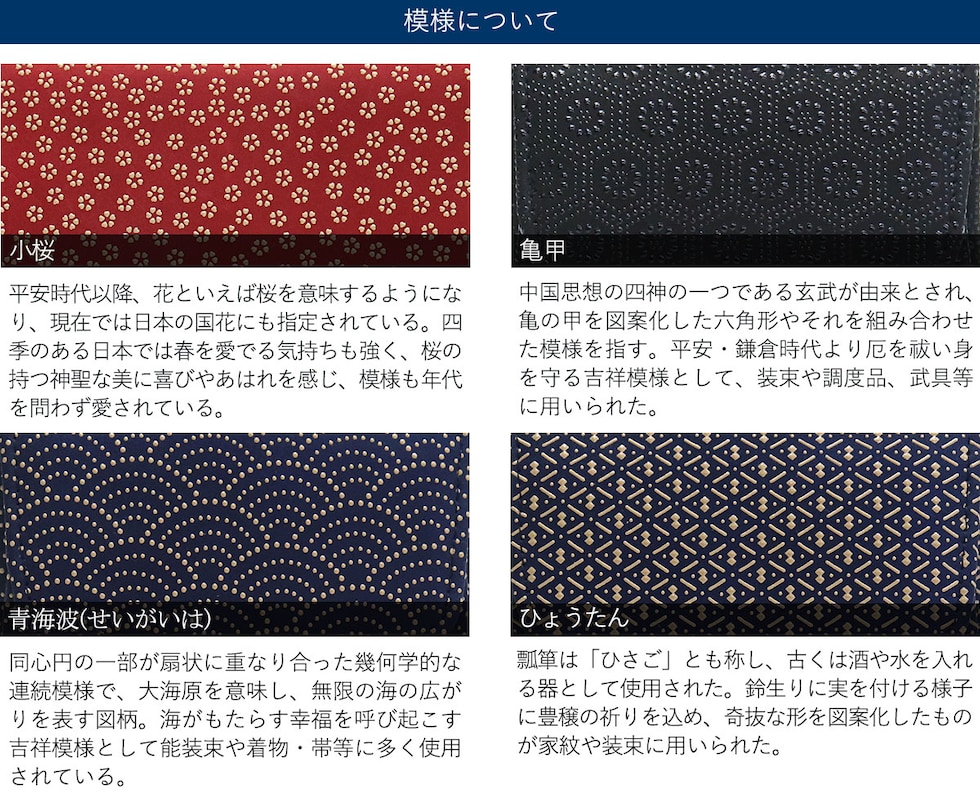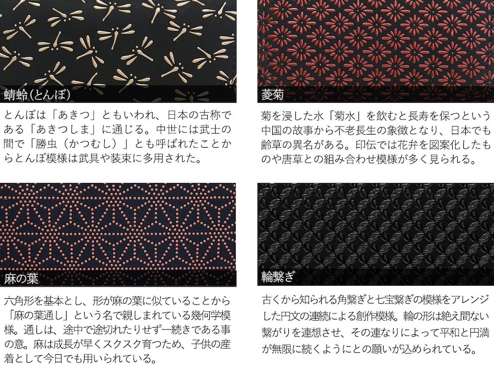 「印伝」の最大の魅力に漆により描かれる美しい柄が挙げられます。青海波やとんぼ、亀甲など江戸小紋にもみられる伝統の柄が、「繊細な造形美の枠」を作りだしています。そして、永く愛用することで剥がれゆく「漆」もまた味わい深さを表現します。