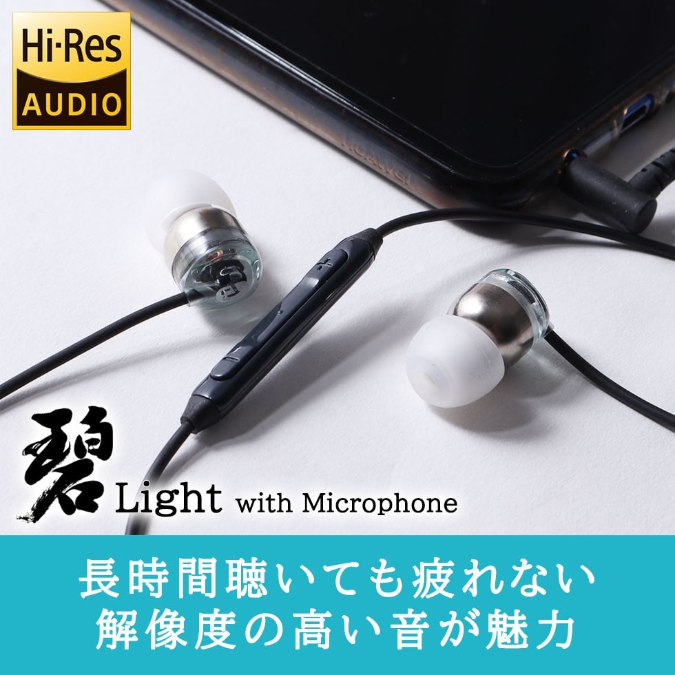 オーツェイド社独自の特許技術VST(Vertical Support Tweeter)の効率化を図り、高品位ウーハーとのバランスを最適化した軽量タイプのハイレゾ対応イヤホン『intime碧Light with Microphone』。VSTのパフォーマンスを向上させ、見通しの良い中高域再生と解像度の高い音を実現しました。長時間聴いても疲れることのない耳に刺さらない音を実現しつつ、さらにボディの軽量化を図り、装着時の物理的な疲れを改善する仕上がりとなっています。