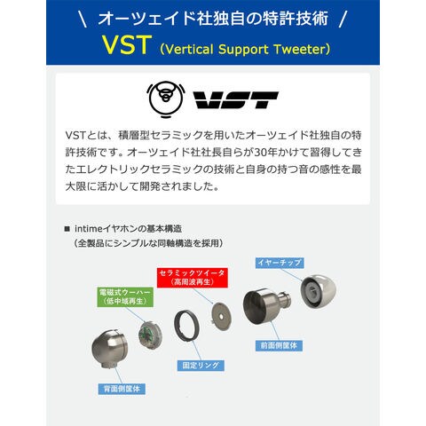 オーツェイド社の特許技術であるVST2を採用。振動特性に優れたニッケル合金の振動板を上下からピエゾセラミックで挟んだ構造を構成してより大きな振動を発生させることで20kHz以上の超高域周波数の音圧感度を向上させています。これにより非常に音場の広い音響空間を実現しています。