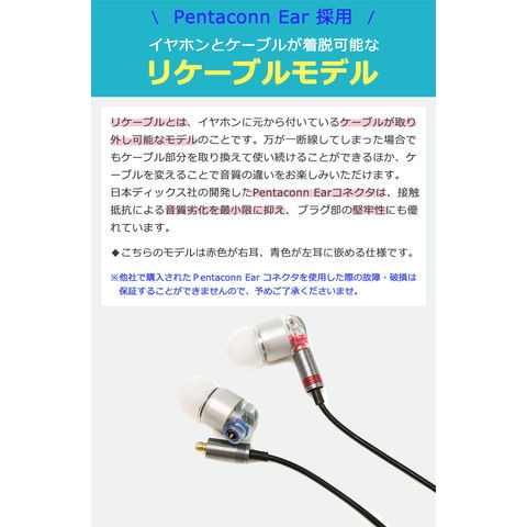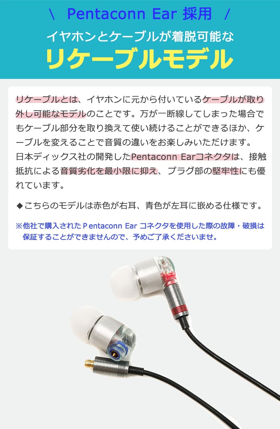 イヤホン本体のケーブル端子部に日本ディックス社のPentaconn Earコネクタを採用。接触抵抗による音質劣化を最小限に抑えるだけでなくプラグ部の堅牢性にも優れています。