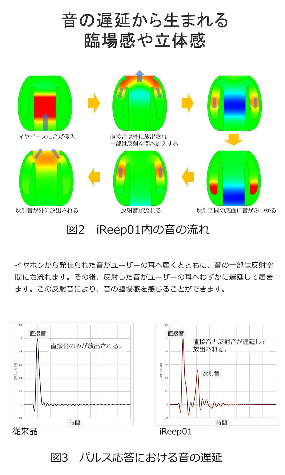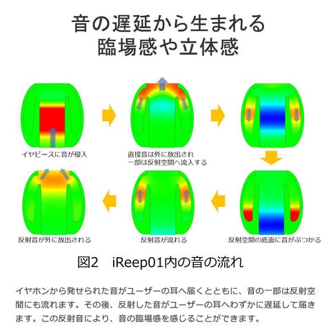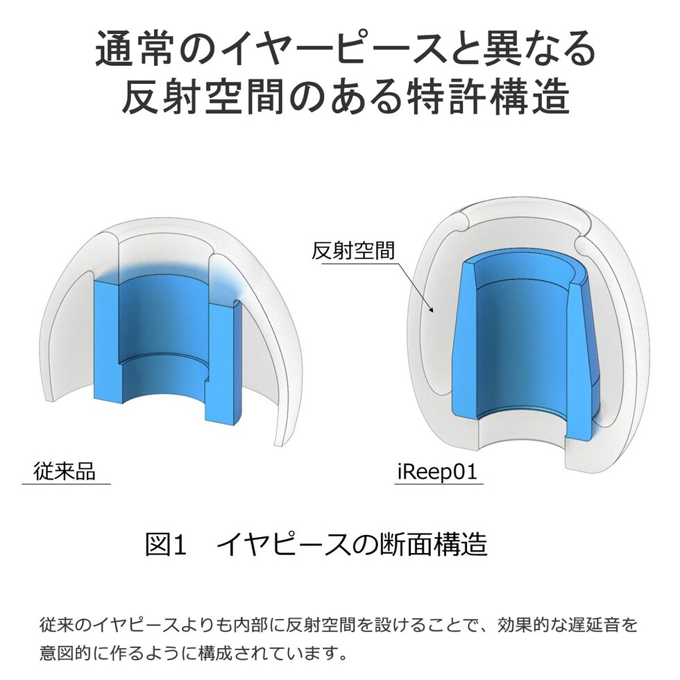 半透明のボディにサイズごとに軸の色が異なるデザインの『iReep01』。4サイズ各1ペアなので、お好みのフィット感でお使い頂けます。まるでその場にいるかのような臨場感を生み出すのは、今までにない画期的でオリジナリティのある特許登録済みの構造にあります。人間の耳は、左右の耳に届く音のずれ(距離や音量)を認識することで、音の方向を把握しているとされています。こちらのイヤーピースでは、その音のずれを作るため反射空間を設け、イヤホンから出る直接音と効果的な反射音により、人の耳に音の立体感を感じさせる構造となっています。