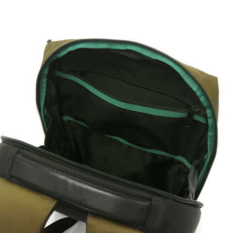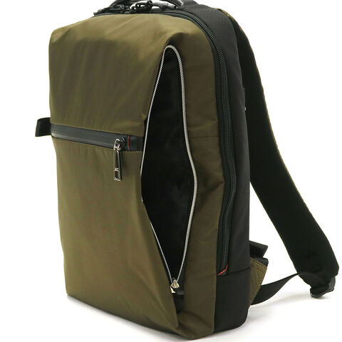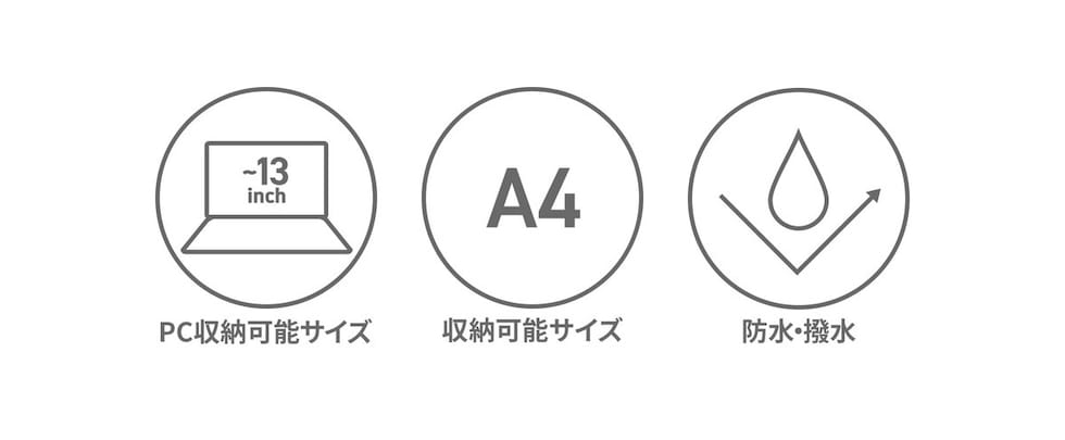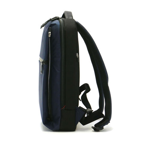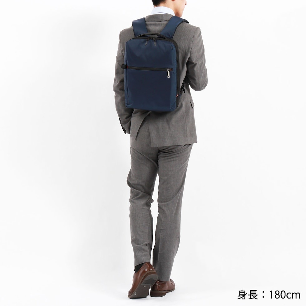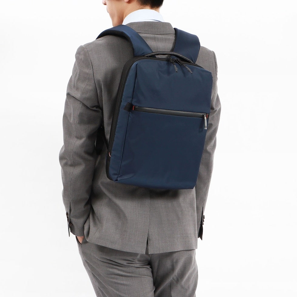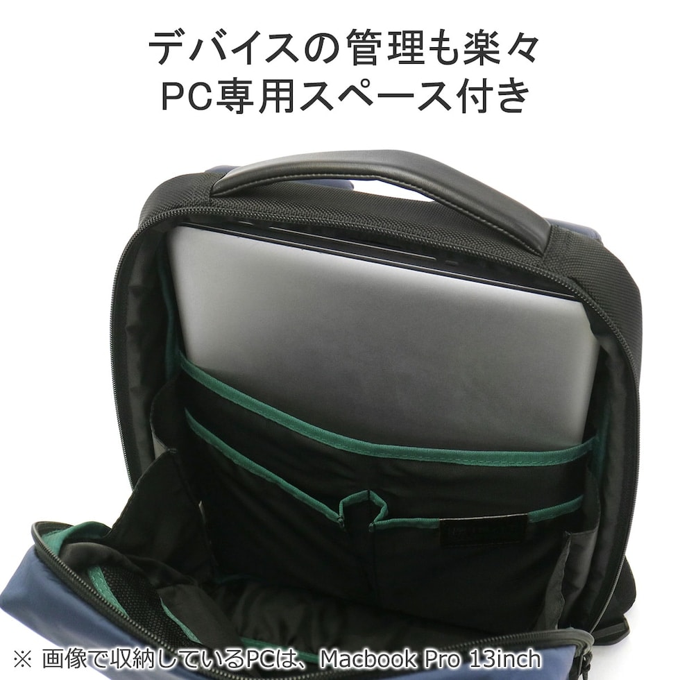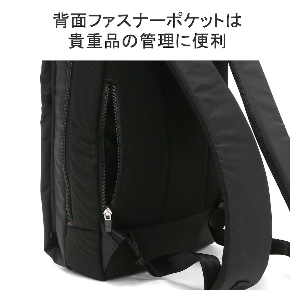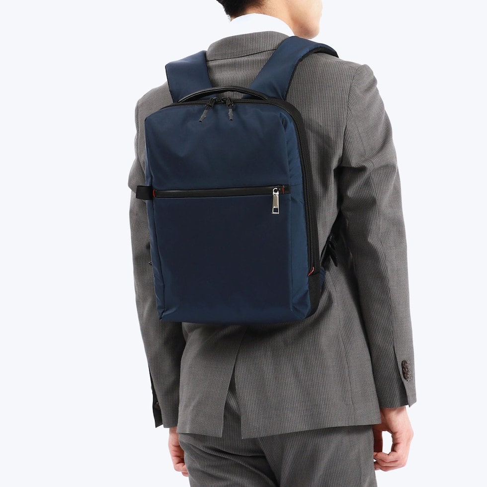 収納部は薄マチでありながら、スクエア型の為、書類やファイルの収まりが良いのが特徴。内部には13インチ対応のPC収納や、細々として散らばりがちなビジネス小物がすっきりと収まるポケットが備わっており、バッグの中の整頓が行いやすい設計になっています。また、本体外側にはセキュリティ面に優れた背面ポケットを備えているので、スマホ等の貴重品の管理に役立ちます。