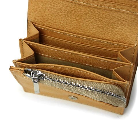 革本来のナチュラルな質感が魅力のイタリアンショルダー「アリゾナ」を使用した二つ折りの財布が登場。コンパクトなサイズ感でありながら、内装には6ヶ所のカードポケットとカードを束ねて収納できる蛇腹マチのポケットが設けられた、実用性の高い設計になっております。