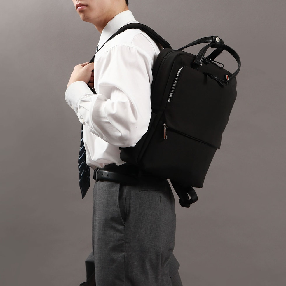 撥水性に優れた素材を使用した、A4サイズの軽量ビジネスリュック。カフェなどの雨よけ屋根(オーニング)をモチーフに、男女ともに身に着けやすいジェンダーニュートラルなデザインがポイントとなっています。ビジネスシーンで重宝する充実した収納機能も魅力です。