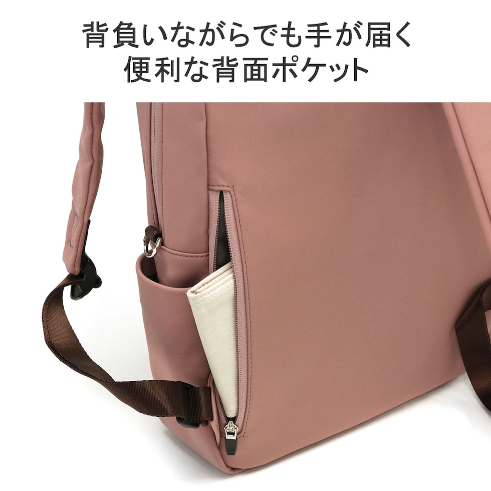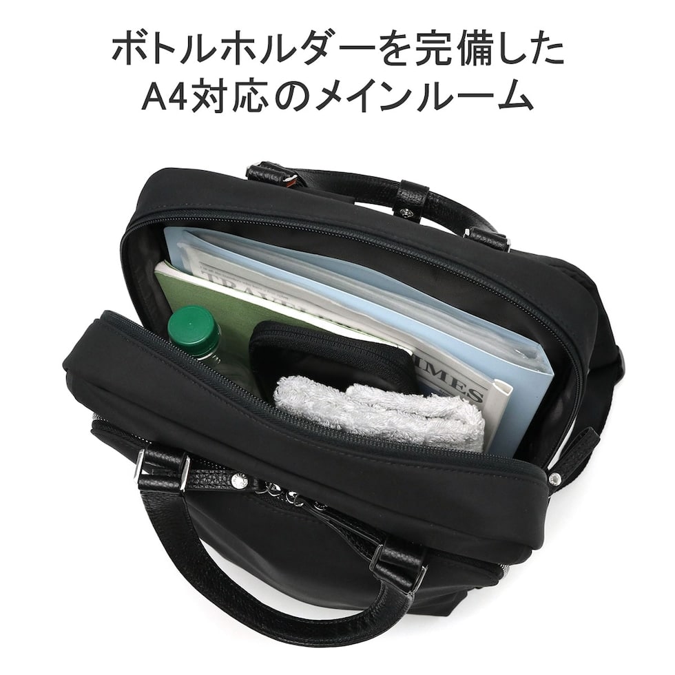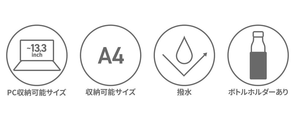 詳細説明 本体には、水滴が滑りやすいマイクロガーター構造と撥水加工を施した素材を使用。マットな質感でありながら、高い耐水効果を持続します。フロントには、アイテムの仕分けや小物収納に便利な2つのファスナーポケットを設置。A4サイズのメインルームにはボトルホルダーやPCスリーブを完備し、様々な荷物をスッキリと収納することができます。