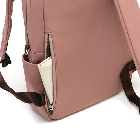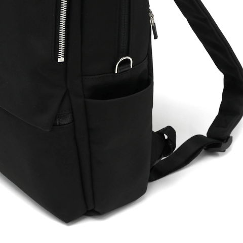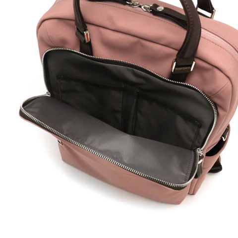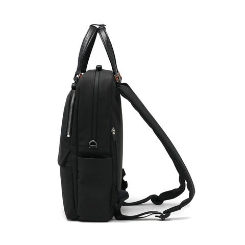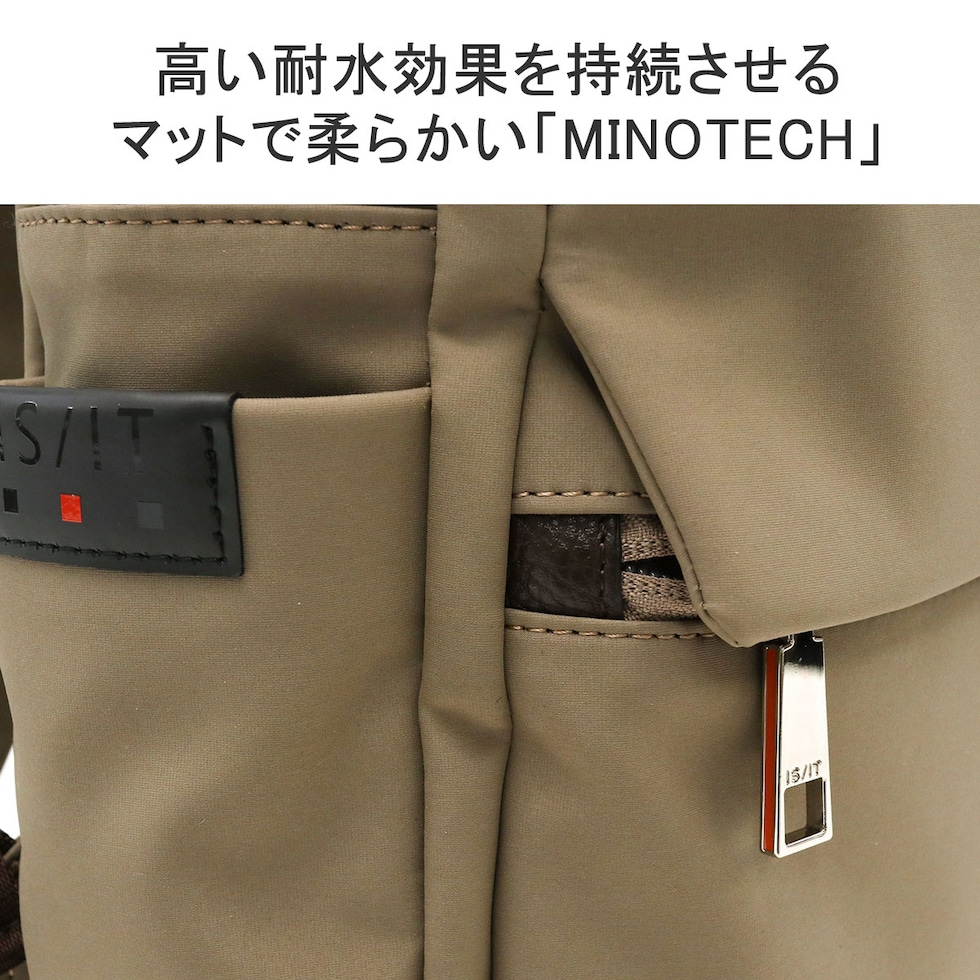 本体には、水滴が滑りやすいマイクロガーター構造と撥水加工を施した素材を使用。マットな質感でありながら、高い耐水効果を持続します。フロントには、アイテムの仕分けや小物収納に便利な2つのファスナーポケットを設置。A4サイズのメインルームにはボトルホルダーやPCスリーブを完備し、様々な荷物をスッキリと収納することができます。