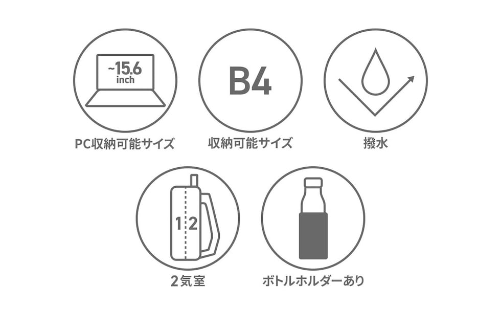 本体には、水滴が滑りやすいマイクロガーター構造と撥水加工を施した素材を使用。マットな質感でありながら、高い耐水効果を持続します。フロントには、アイテムの仕分けや小物収納に便利な2つのファスナーポケットを設置。2層のメインルームには、前面側に大きめのジップポケットを、背面側にPCスリーブを完備し、書類やデバイス類を効率よく収納できる仕様となっています。