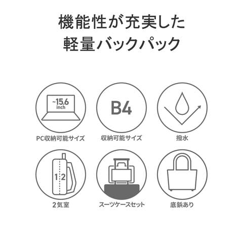 軽量・撥水・機能性を併せ持った15.6インチPC対応のリュック。毎日の通勤で大切なPCやタブレットを安全に持ち運べるのは勿論、便利なポケットが充実。さらに、撥水性の高いポリエステルと撥水加工を施したコイルファスナーを採用し、突然の雨にも配慮された仕様となっています。