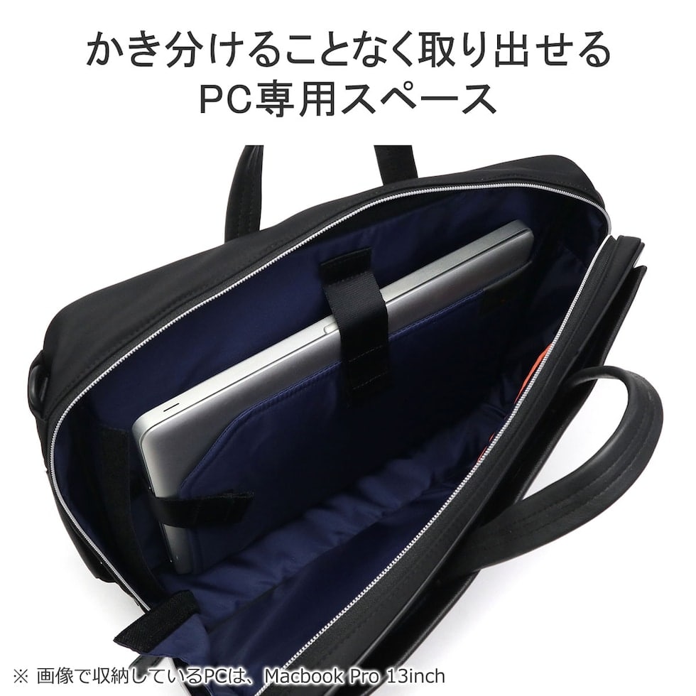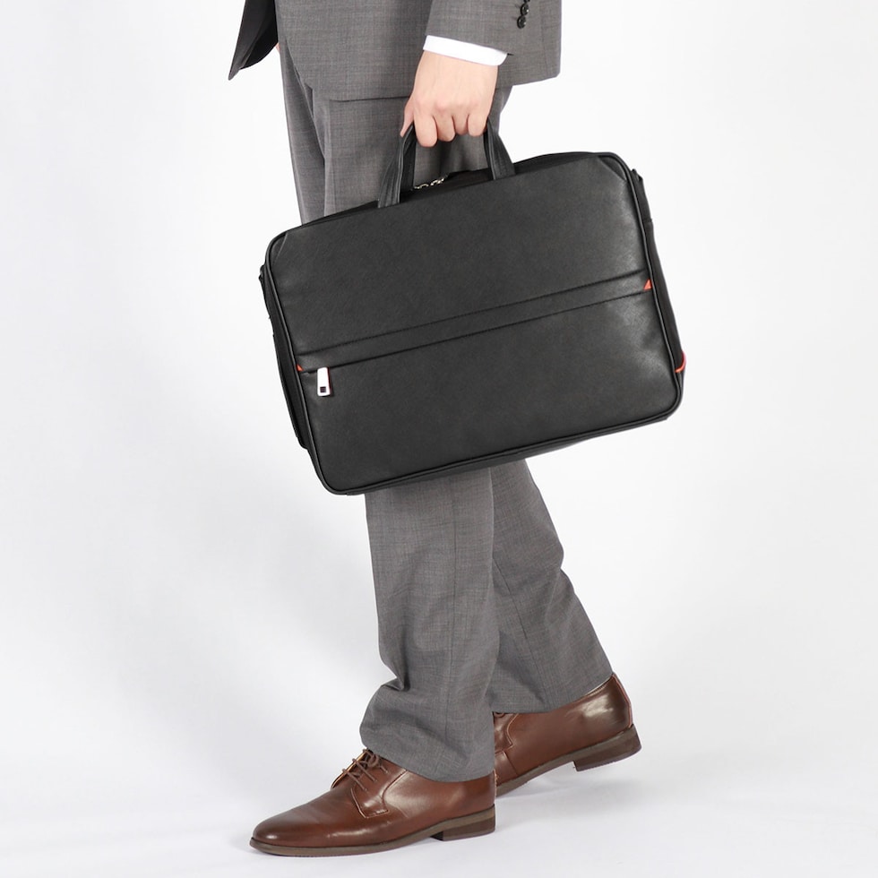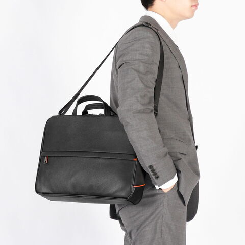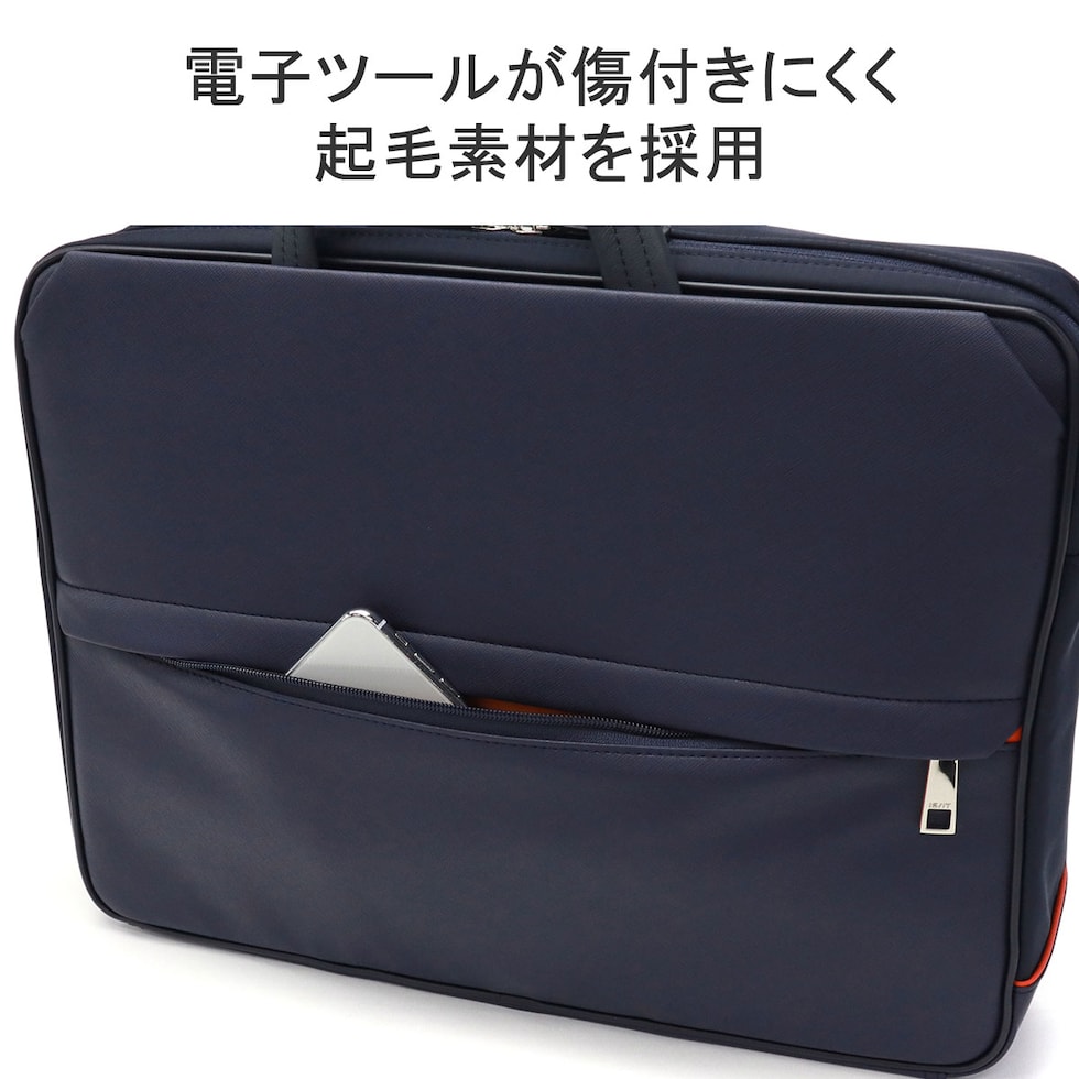 詳細説明 メインコンパートメントは、中身を一目で把握できるシンプルな構造。外側正面のファスナーポケットには、電子ツールが傷付きにくく、見やすいオレンジ色のパイル地を使用しております。また前面にはあおりポケットがあり、ハンドル収納はもちろんすぐに取り出したいアイテムの収納にも便利です。ビジネスシーンに特化した機能が随所に施され、日々の仕事を快適に過ごせます。