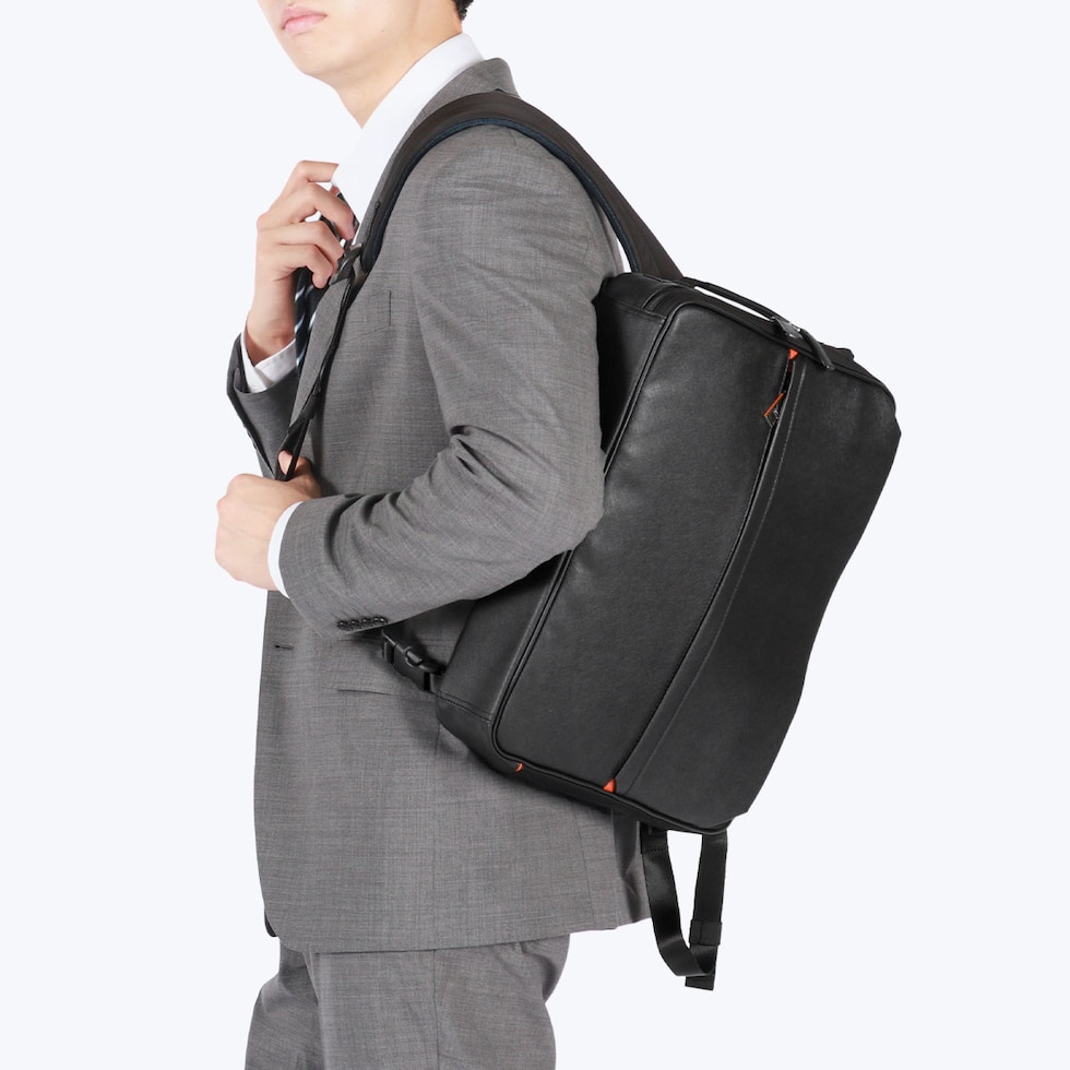 メインコンパートメントは、中身を一目で把握できるシンプルな構造。外側正面のファスナーポケットには、電子ツールが傷付きにくく、見やすいオレンジ色のパイル地を使用しております。また前面にはあおりポケットがあり、ハンドル収納はもちろんすぐに取り出したいアイテムの収納にも便利です。ビジネスシーンに特化した機能が随所に施され、日々の仕事を快適に過ごせます。