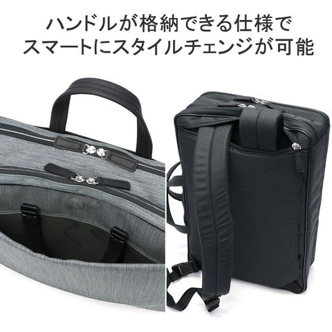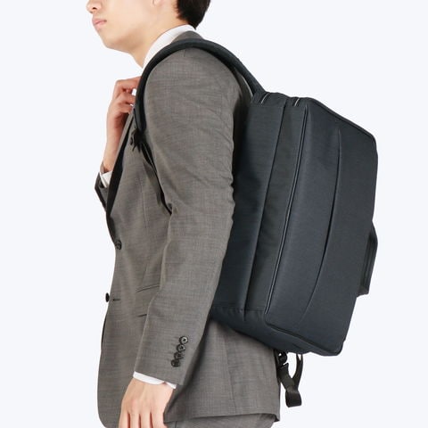 エコ通勤やジャケットスタイルにも合う「ルシェル」をより機能的にアップデートした『ルシェルII』シリーズ。こちらは、B4サイズ対応の3WAYビジネスバッグです。主素材にはシャンブレー調のポリエステル生地に撥水加工を施した生地を使用し、軽量に仕上げました。シンプルなデザインながらも、格納式のハンドルや、スマホなどの電子ツール収納に適したポケットなど機能性の充実したアイテムです。