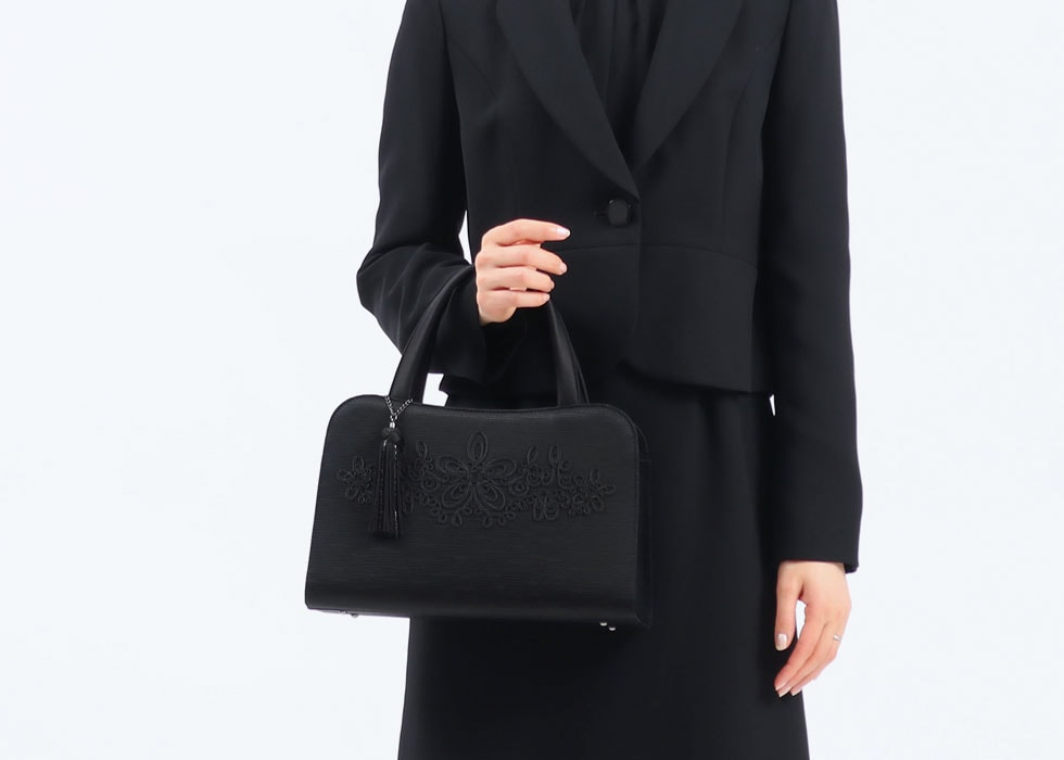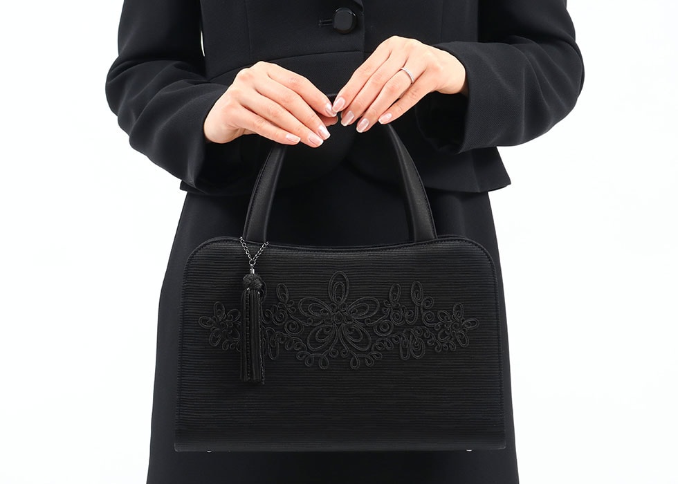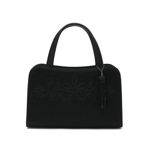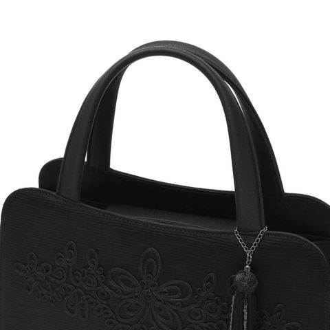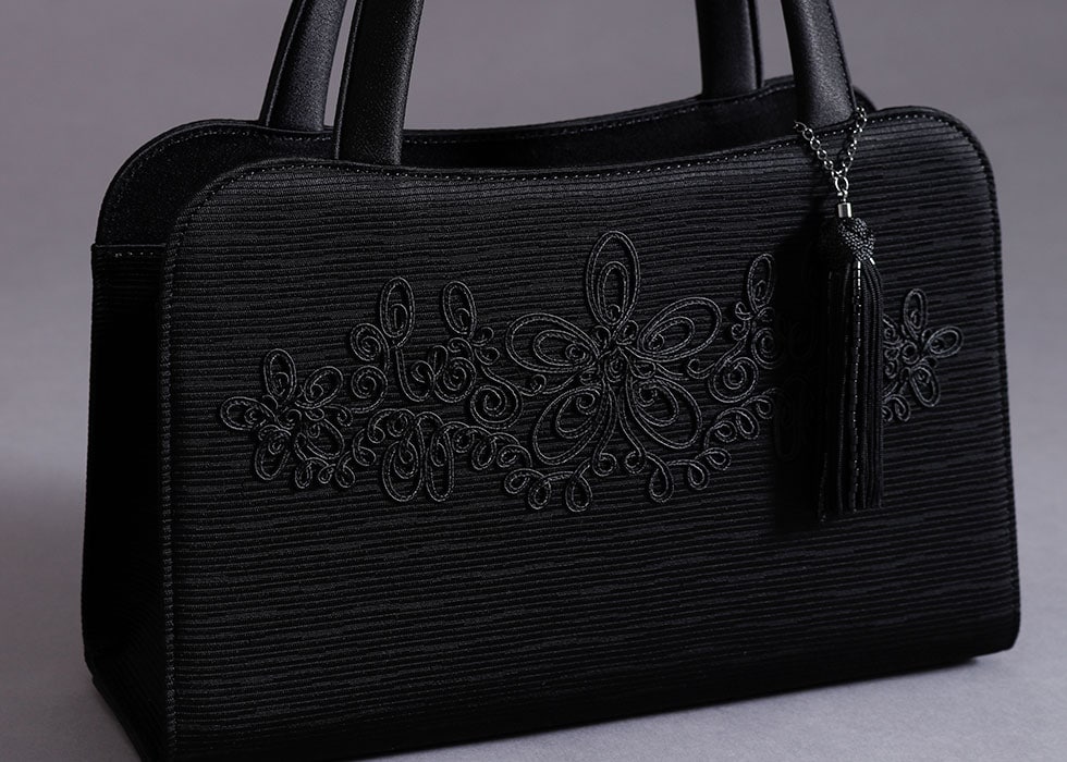 全体にグログラン調の米沢織を使用し、ポイントにコード刺繍を施すことで、フォーマルでありながら華やかさのあるデザインに。年齢を問わずお使いいただけるため、長く持てるアイテムとなっています。また、タッセルはシーンに合わせて自由に取り外していただけます。