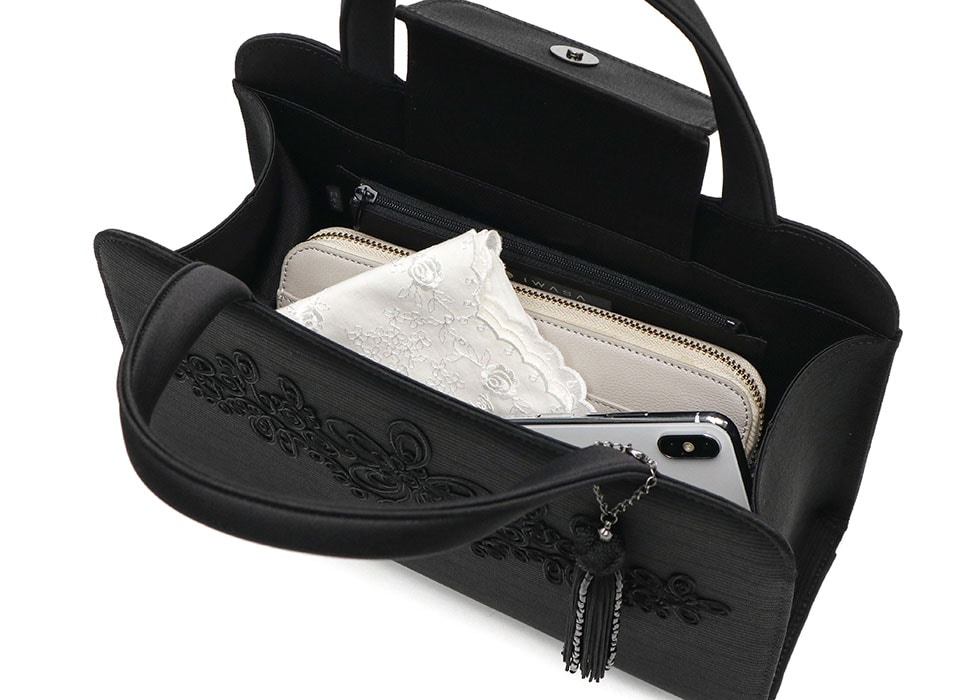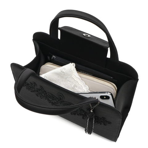 きちんとした芯の入った曲線フォルムが女性らしく優美なフォーマルバッグ。米沢織の中でも多くの人々に愛されるグログラン調の生地に、繊細な刺繍やふわりとゆれ動くタッセルがポイントとなり、手元を上品に飾ります。表面には撥水・撥油加工が施され、お手入れもしやすくなっています。