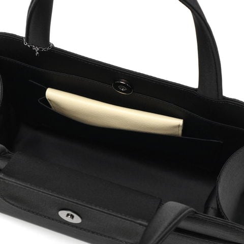 収納部はお財布やスマートフォン等の必需品を収納でき、口元にはしっかりとしたマグホック開閉の蓋が付いているため、安心してご使用いただけます。内側には2つのポケットを、外側には案内状やICカードなどが入るポケットを1つ設け、細々とした物も綺麗に収まります。