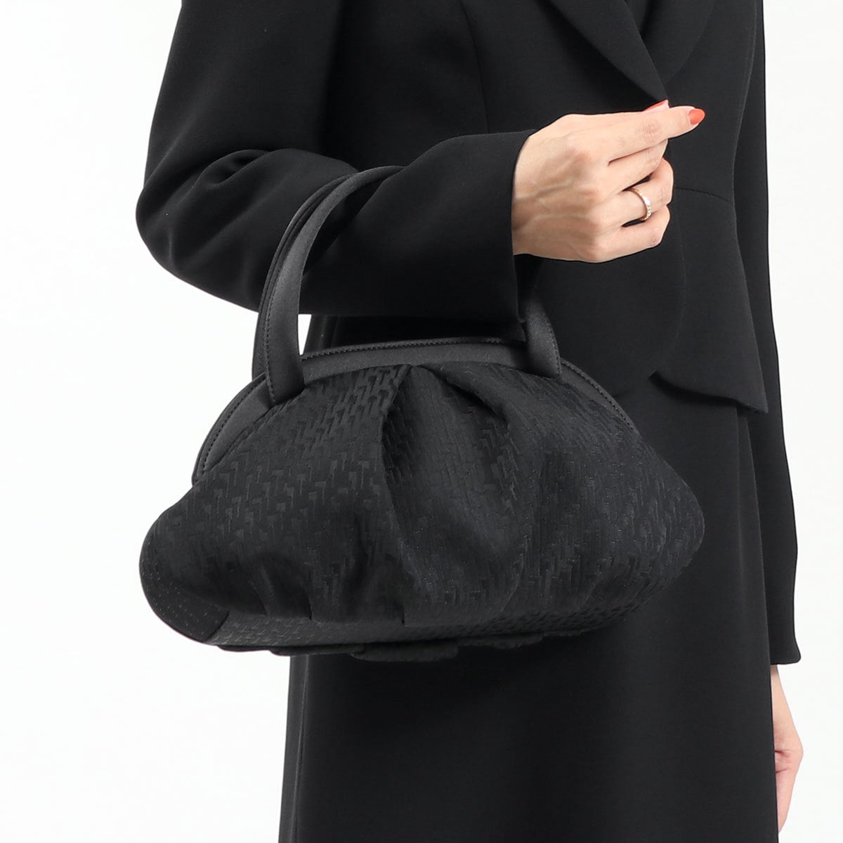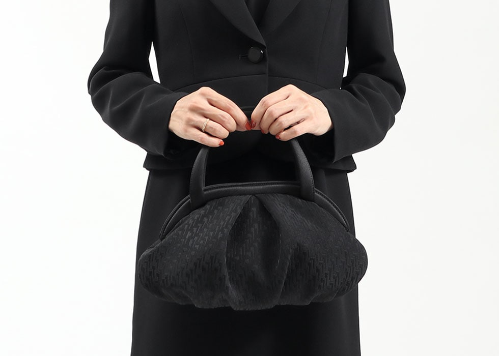 立体感のある人気の米沢織を全面に使用した、大人顔で高級感のあるフォーマルバッグ。コロンとした丸みのあるシルエットは、哀しみの席だけでなく多くのフォーマルシーンに使用可能です。表面に撥水・撥油加工が施されているため、多少の雨や保管時にも安心です。