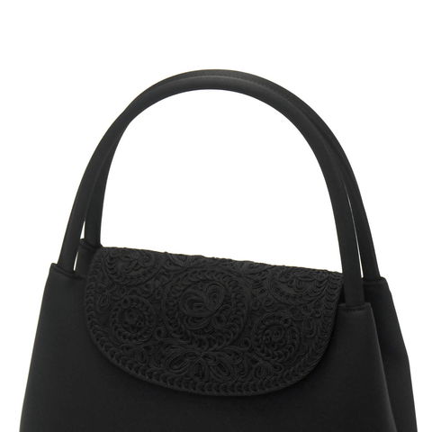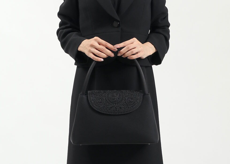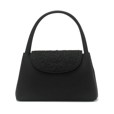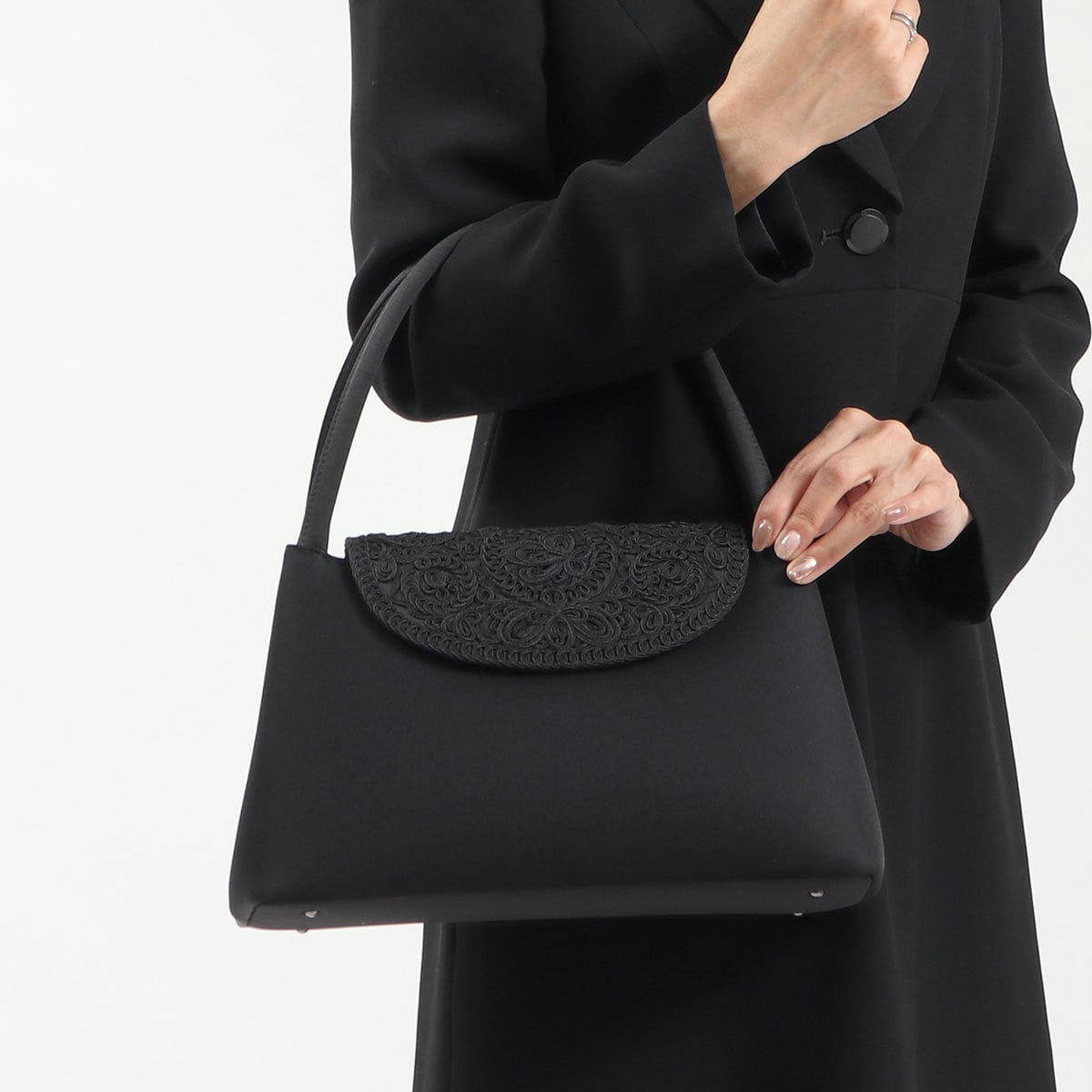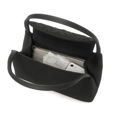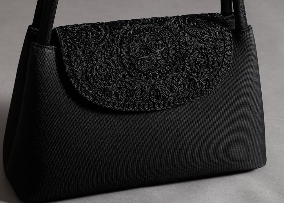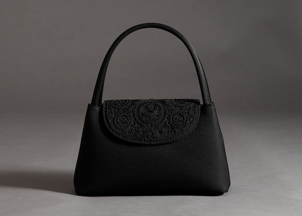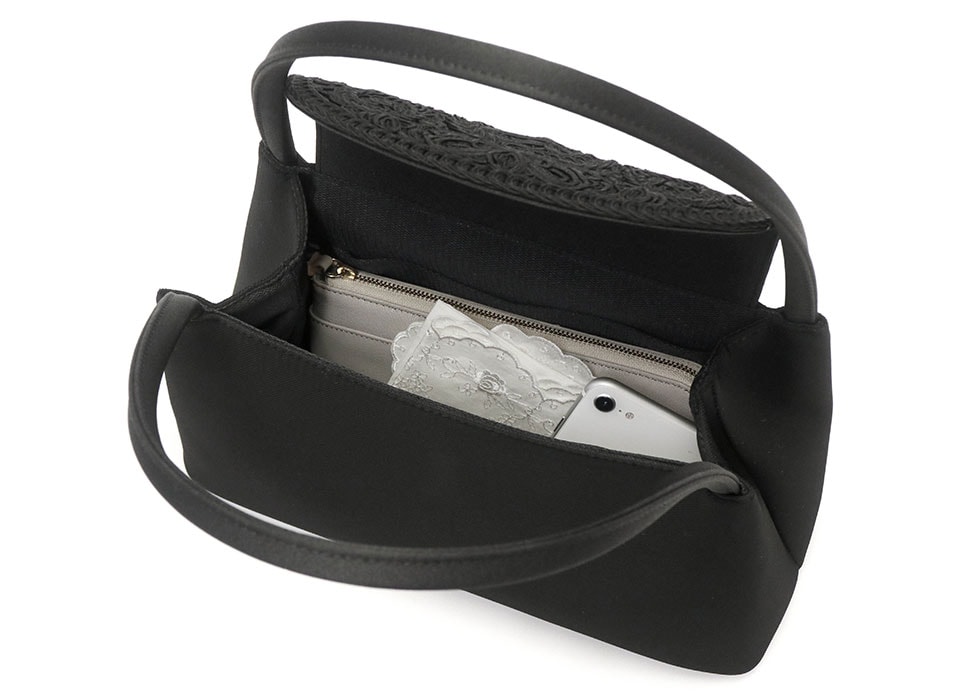 被せ部分全体にコード刺繍を施し胴体部は米沢織を用いた高級感のあるソフト仕立てフォーマルバッグ。軽量芯を用いている為、収納力のあるサイズながら非常に軽快にご使用いただけます。さらに、生地には撥水加工を施しているため、雨の日でも安心です。