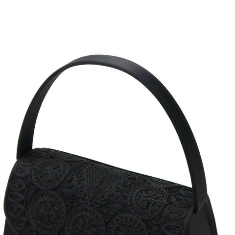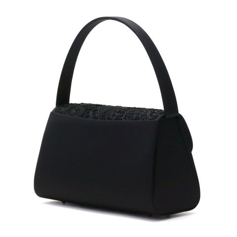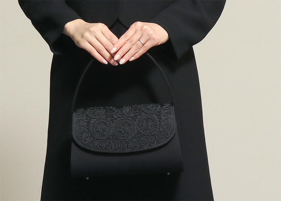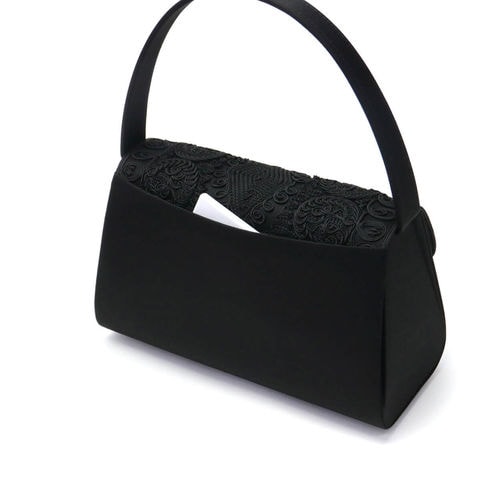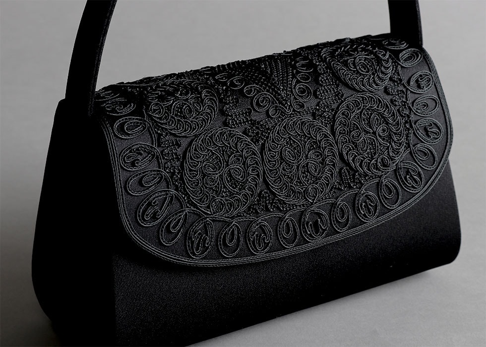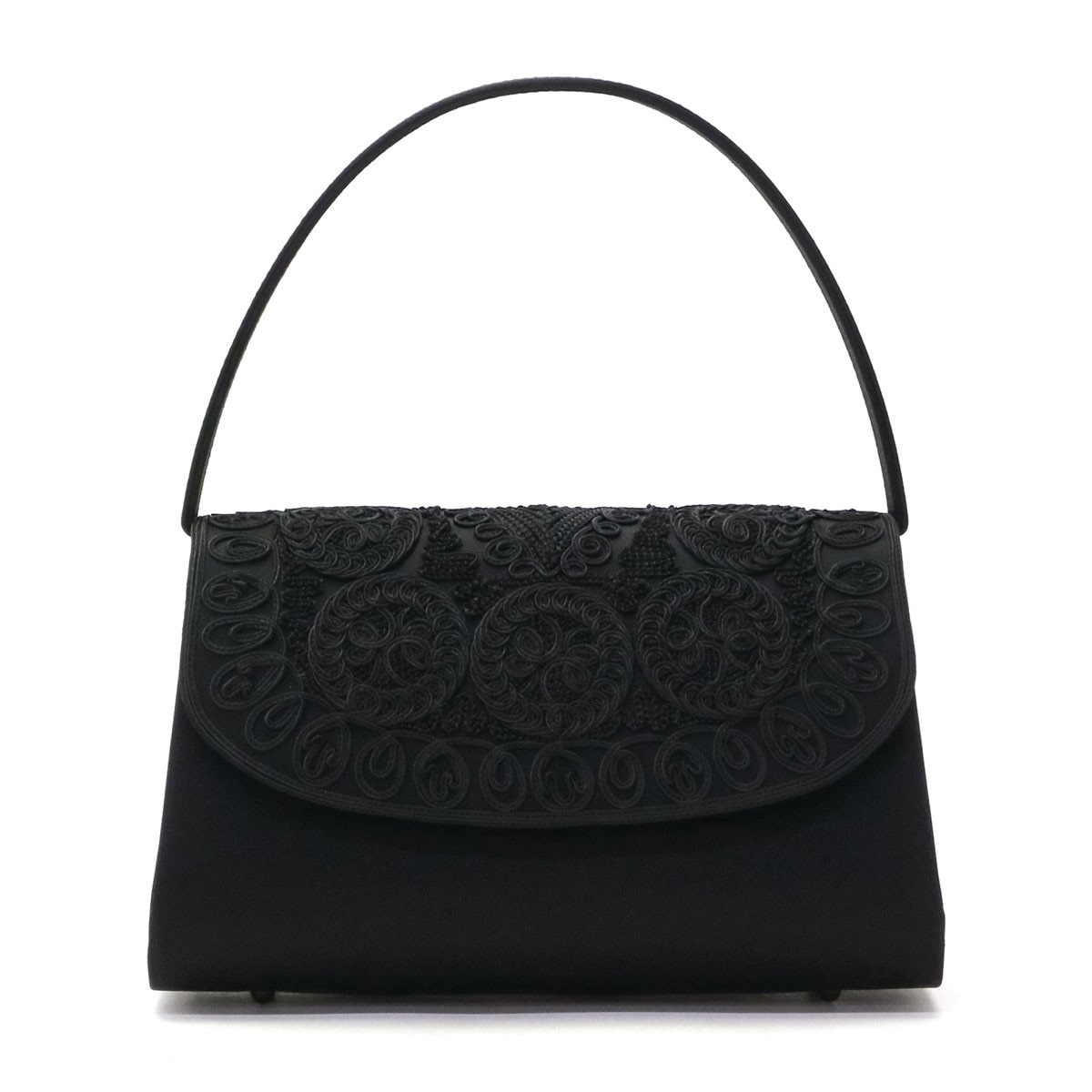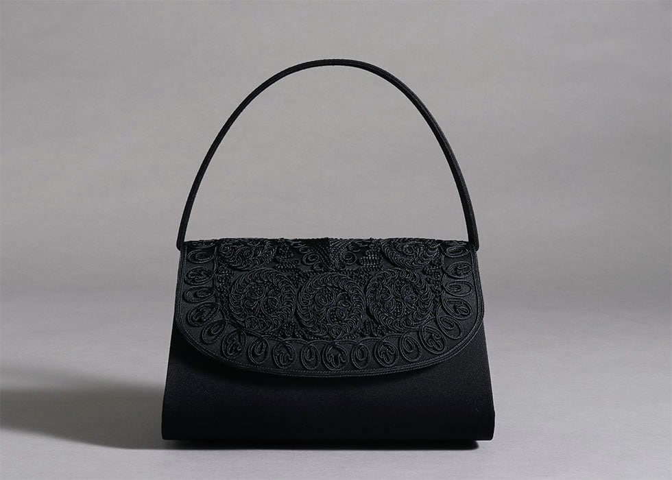 かぶせ部分に施されたアラベスク模様のコード刺繍がエレガントなフォーマルバッグ。細い紐をさまざまな形に縫い付けて模様を描き、華麗に装飾するコード刺繍。生地の上にコードを置き、別糸で目立たないように布の上に綴じつけて、多様な模様を立体的に浮き立たせます。細かい作業が必要な手の込んだ技法で、熟練の縫製職人が丹精込めて手がけています。刺繍糸以外は、クリーンコート加工(撥水・撥油・抗菌・防カビ)により雨の日や保管時にも安心してご使用いただけるのもポイントです。