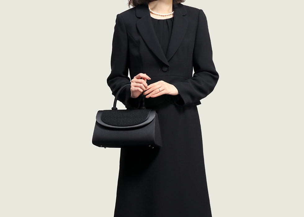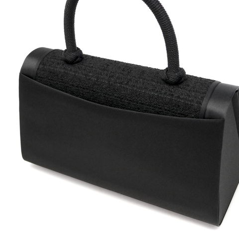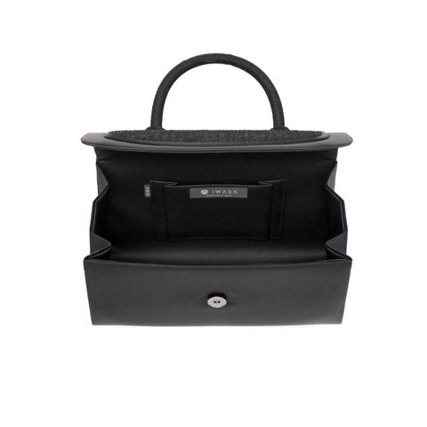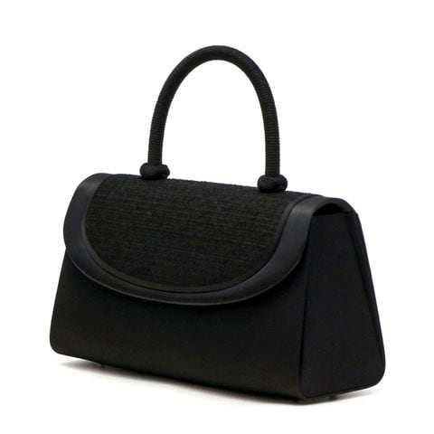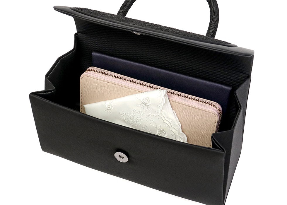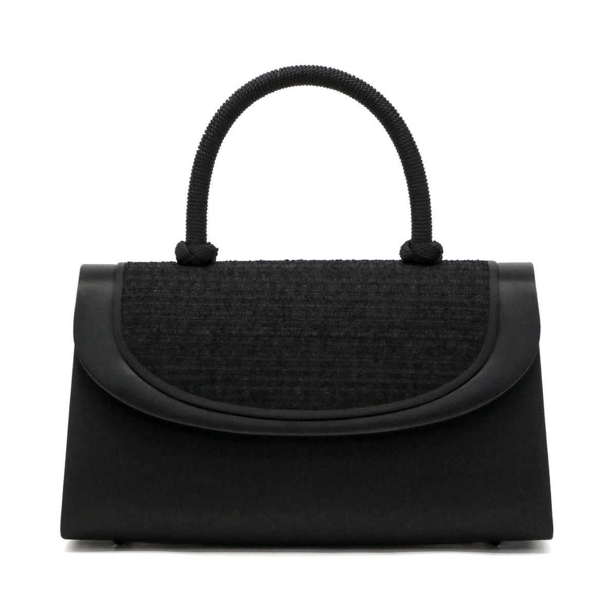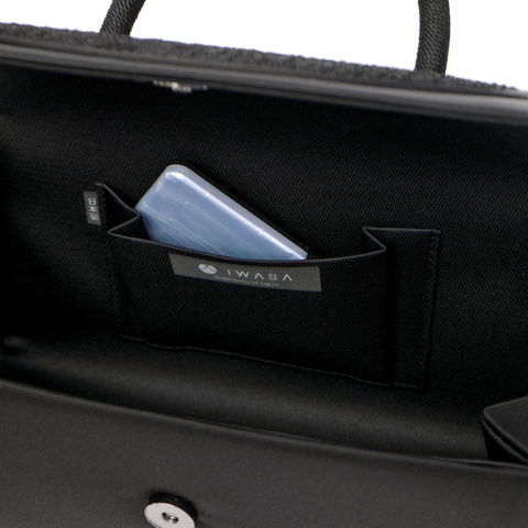 米沢織の縁をサテンでパイピングし、メリハリのあるデザインに仕上げられたフォーマルバッグ。被せ部分に米沢織ツイード素材、編み手には岩佐オリジナルのものを使用し、その組み合わせが凛とした高級感ある雰囲気を演出しています。さらに、生地には撥水・撥油加工を施しているため、雨の日にも安心してご使用いただけます。